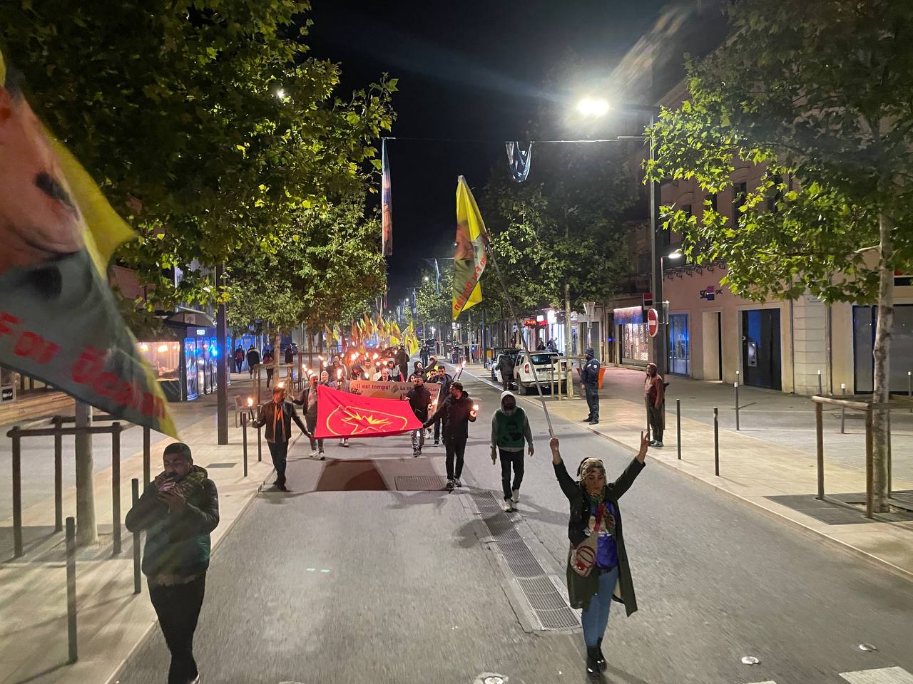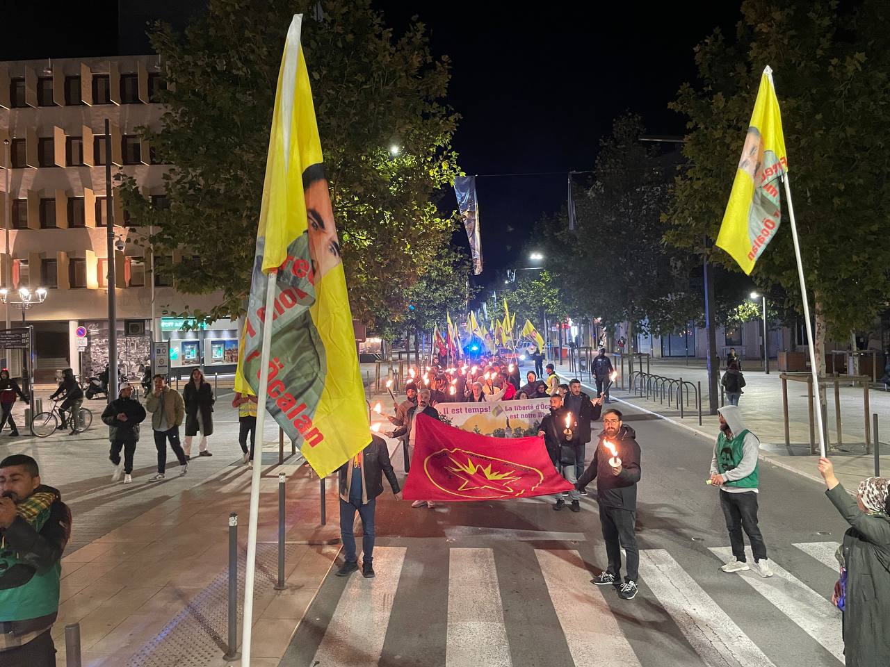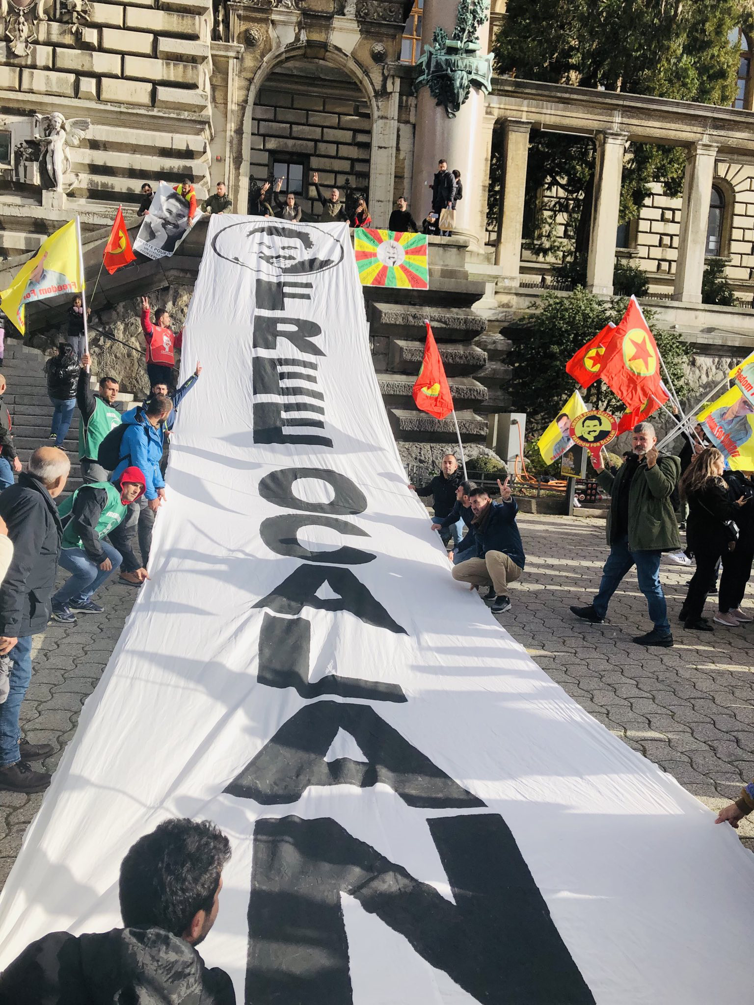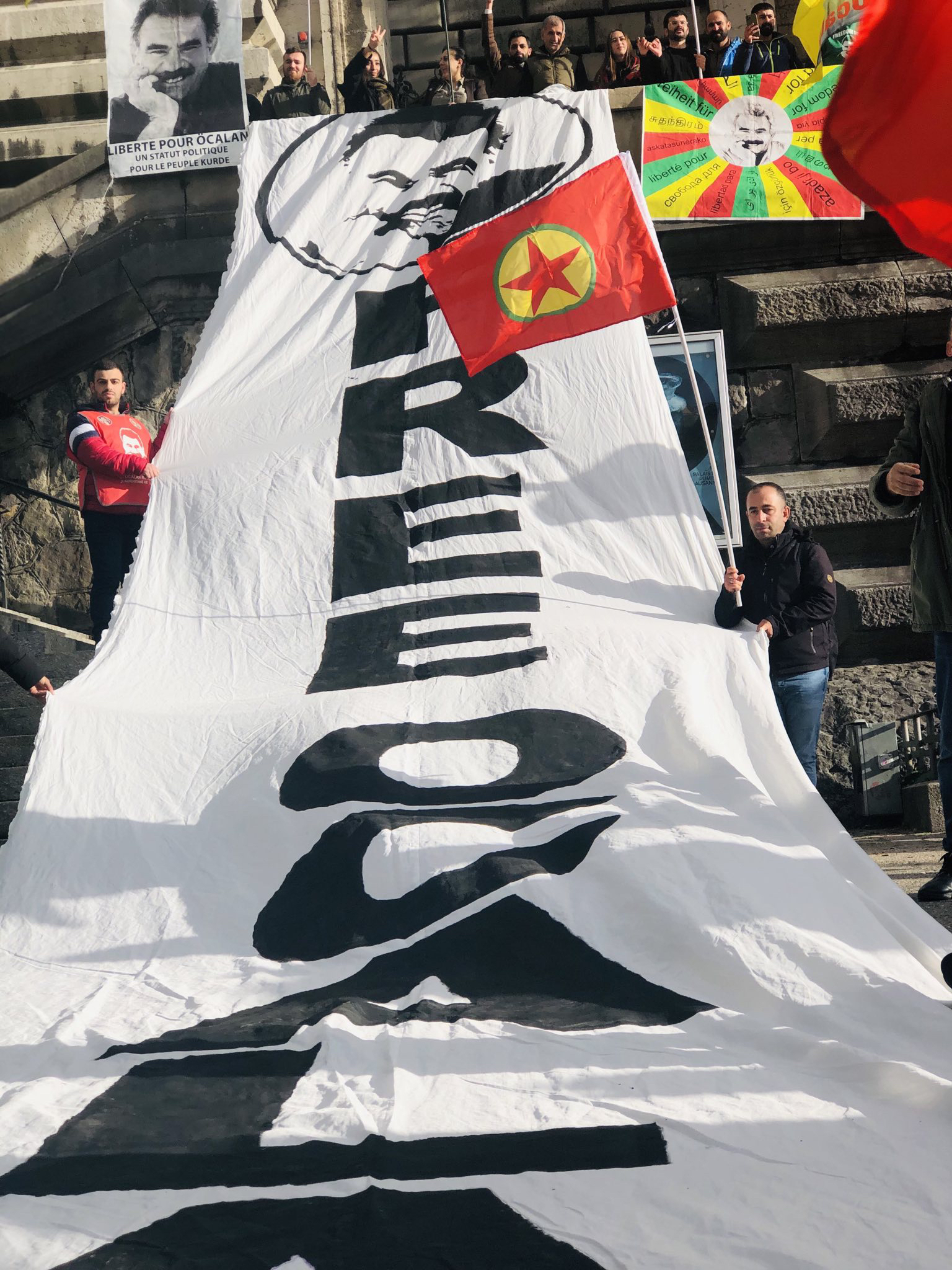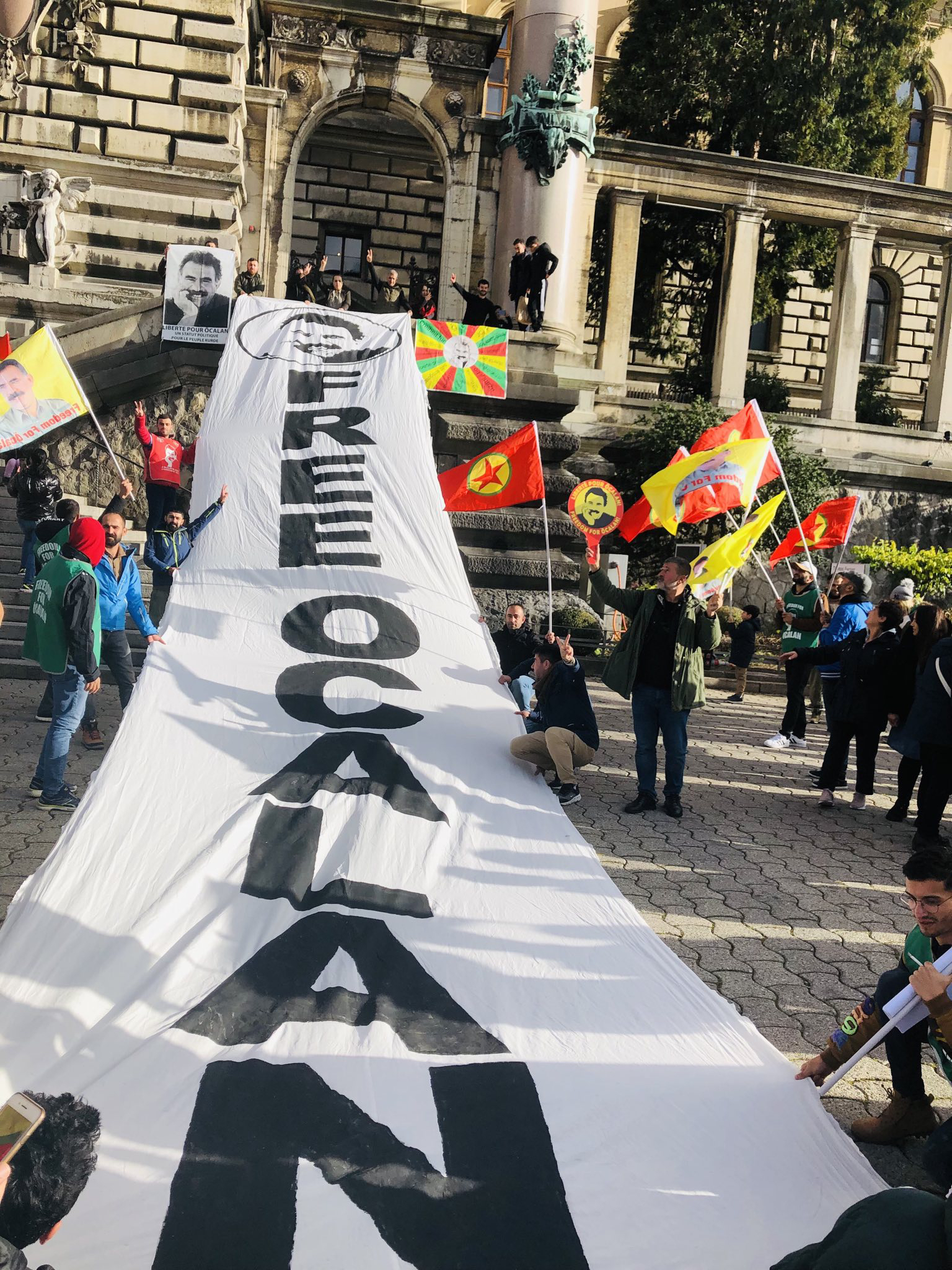 Gençler “Free Öcalan” (Öcalan’a Özgürlük) yazılı yaklaşık 15 metrelik pankart ve Önder APO, PKK bayrakları ile Place de Riponne meydanında eyleme başladılar.