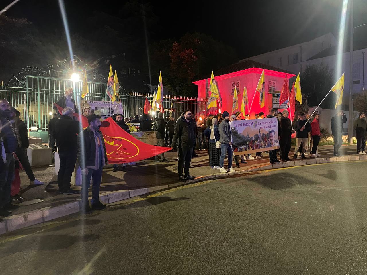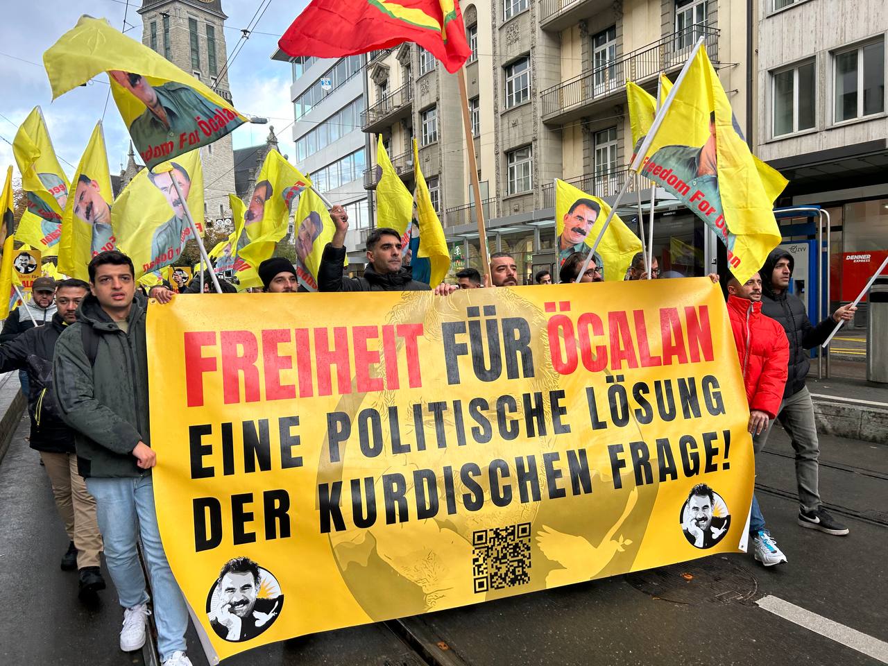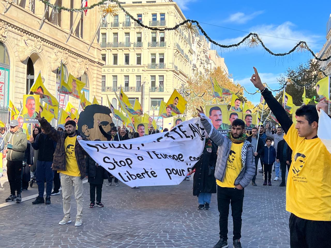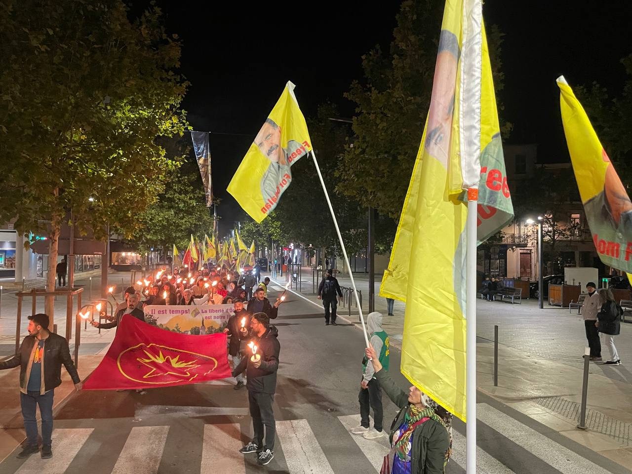 Gençler “Free Öcalan” (Öcalan’a Özgürlük) yazılı yaklaşık 15 metrelik pankart ve Önder APO, PKK bayrakları ile Place de Riponne meydanında eyleme başladılar.