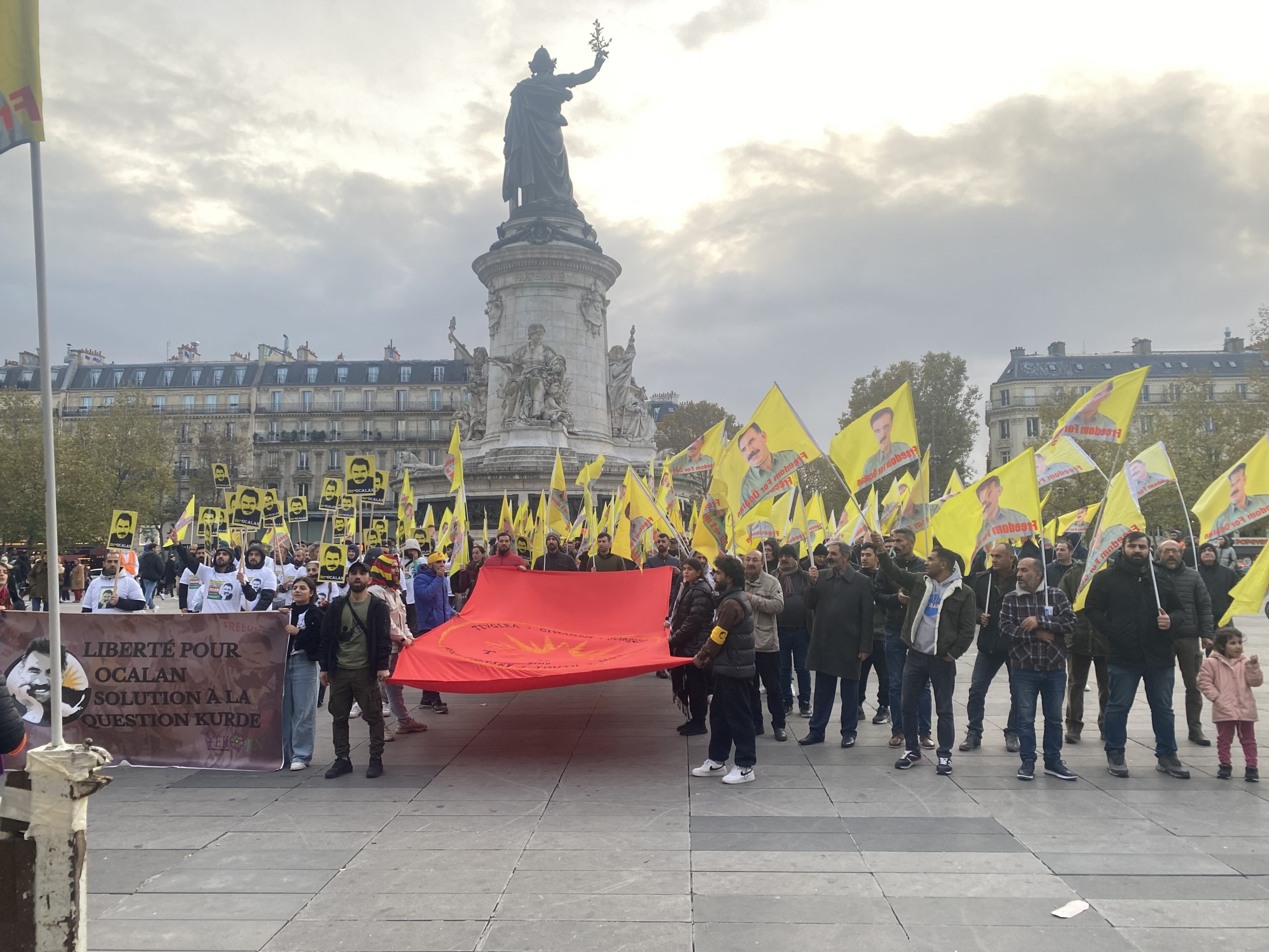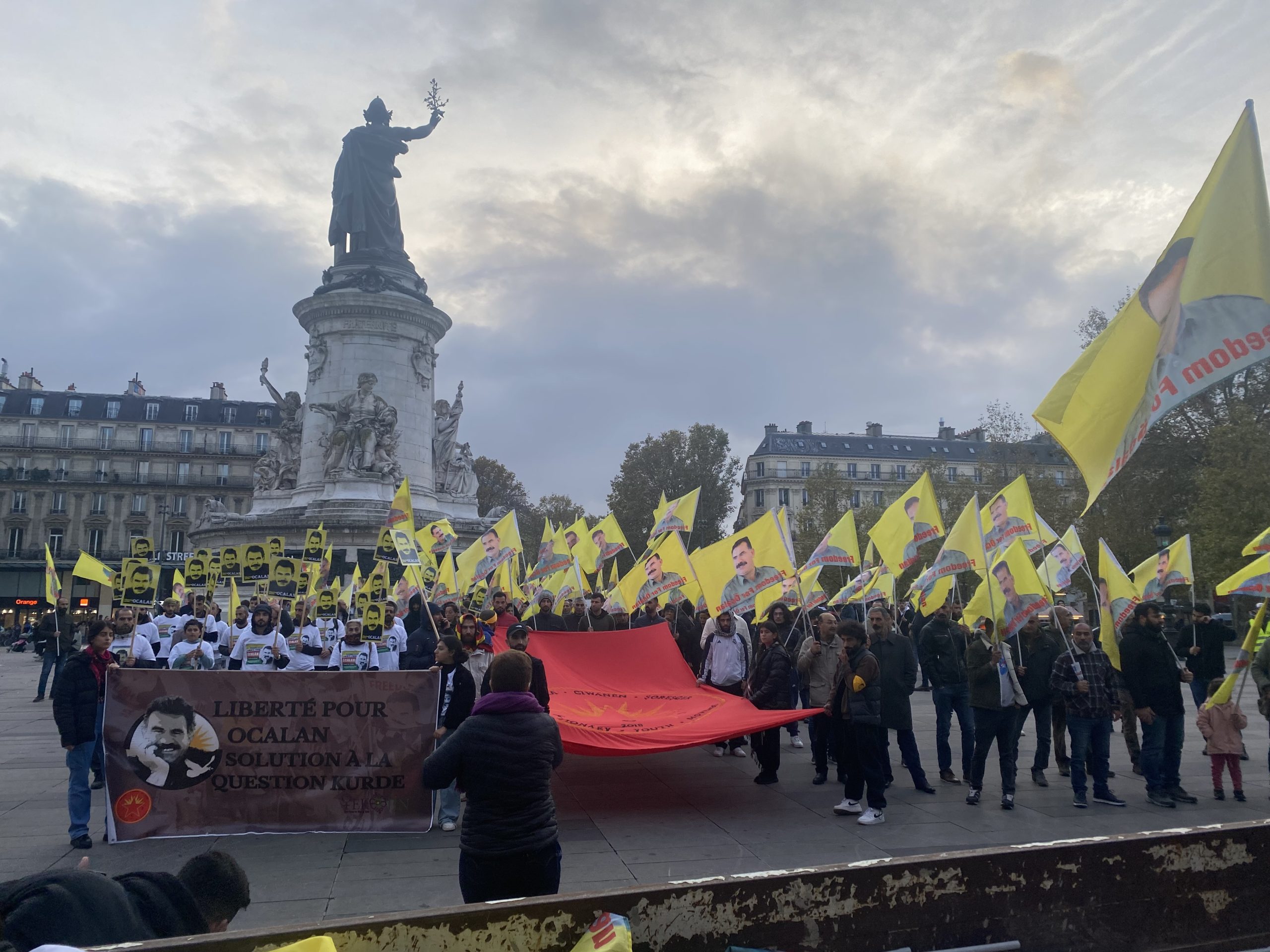 Republique Meydanına kadar “Bijî Serok APO” sloganları eşliğinde büyük bir coşku ile yürüyen gençler burada bir basın açıklaması gerçekleştirdi.