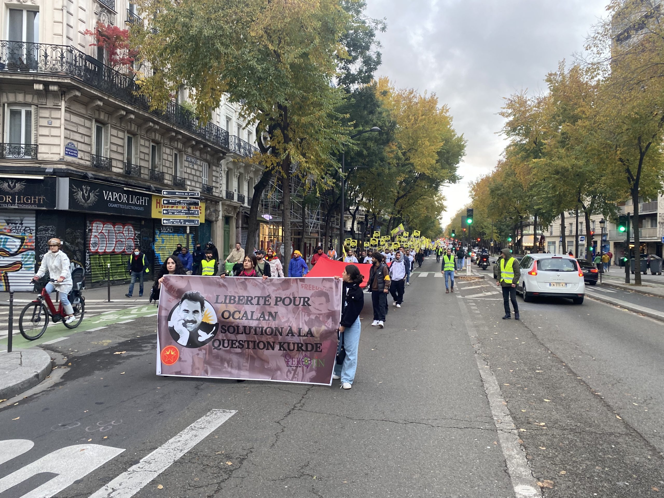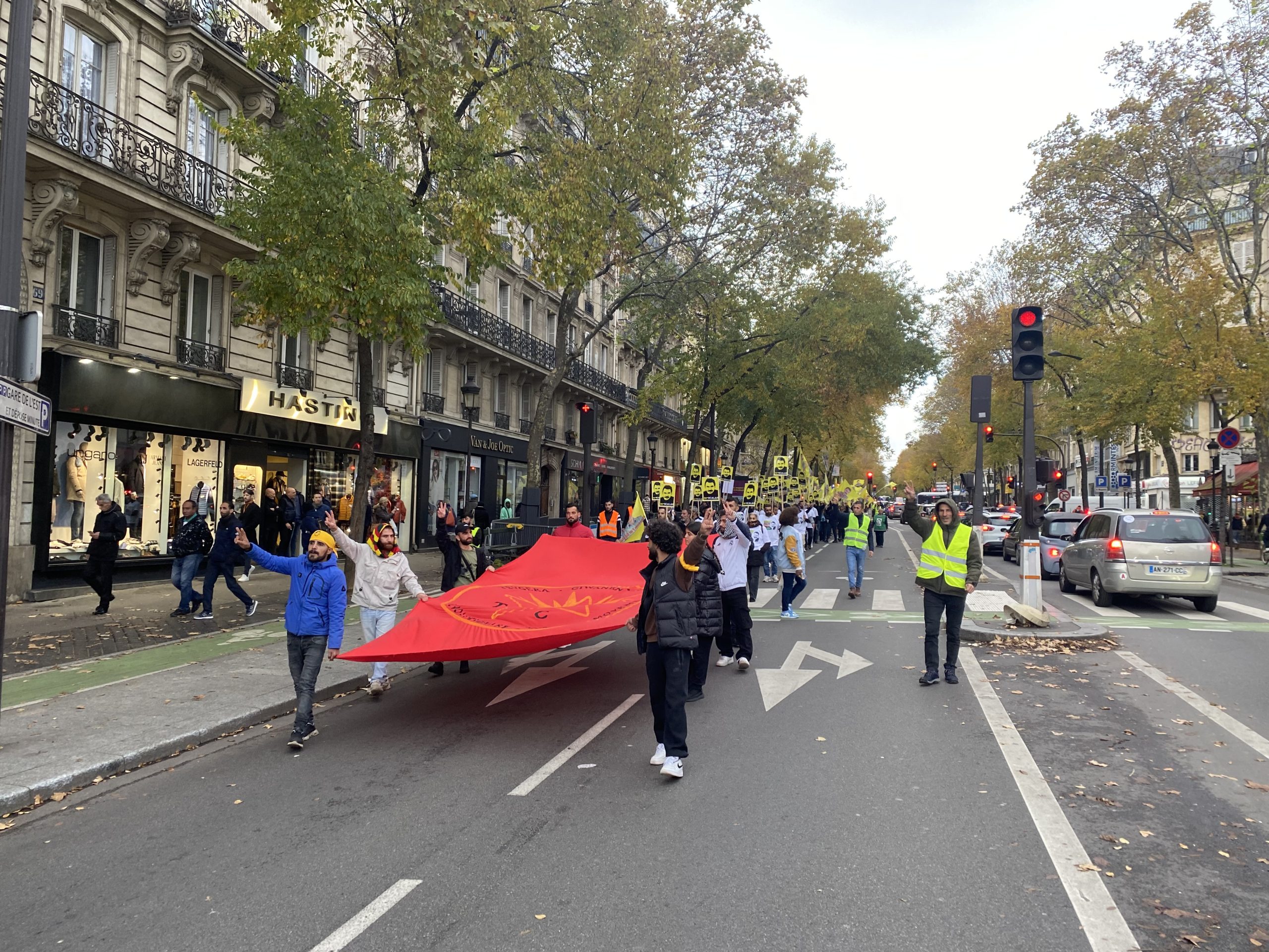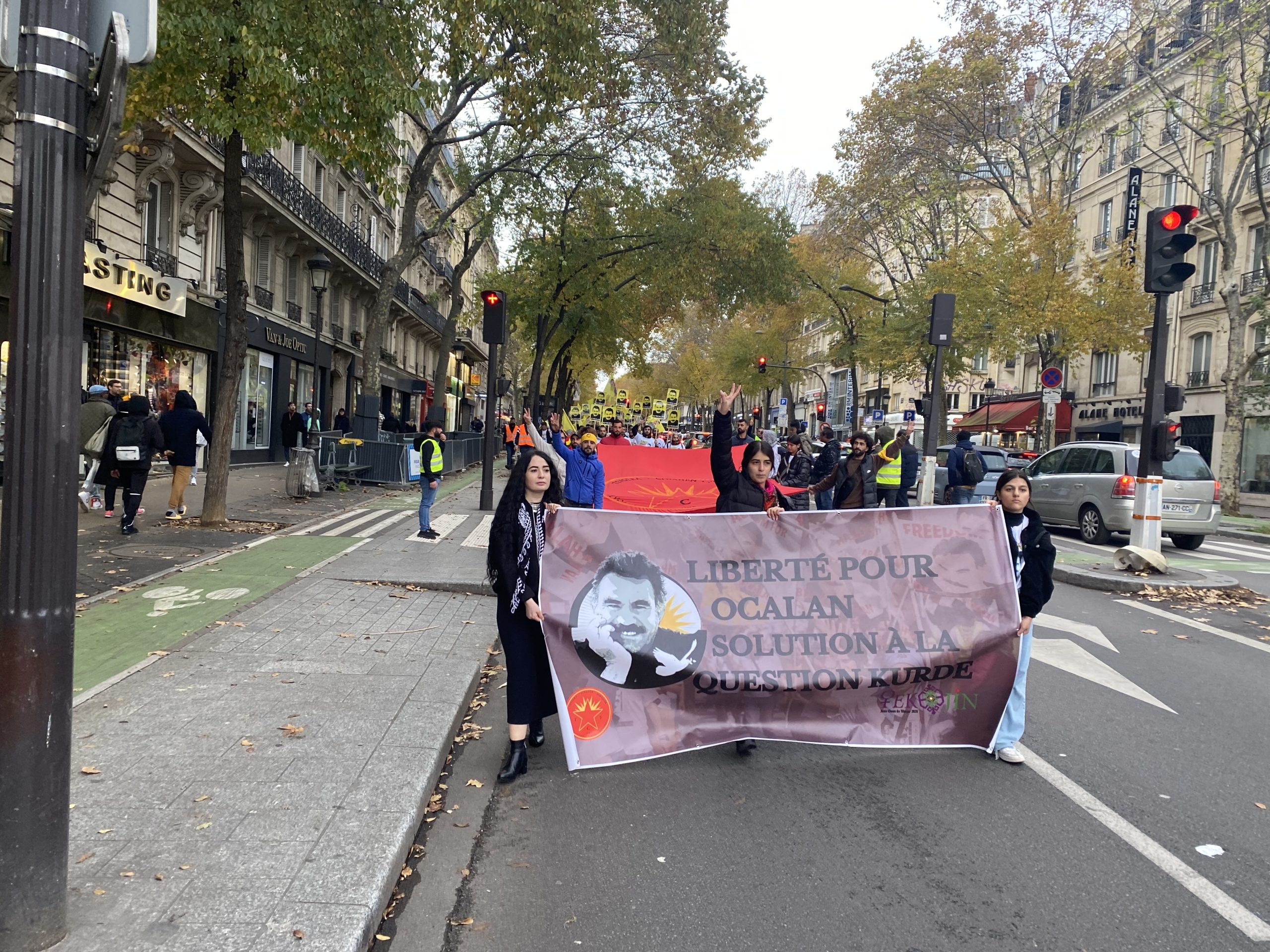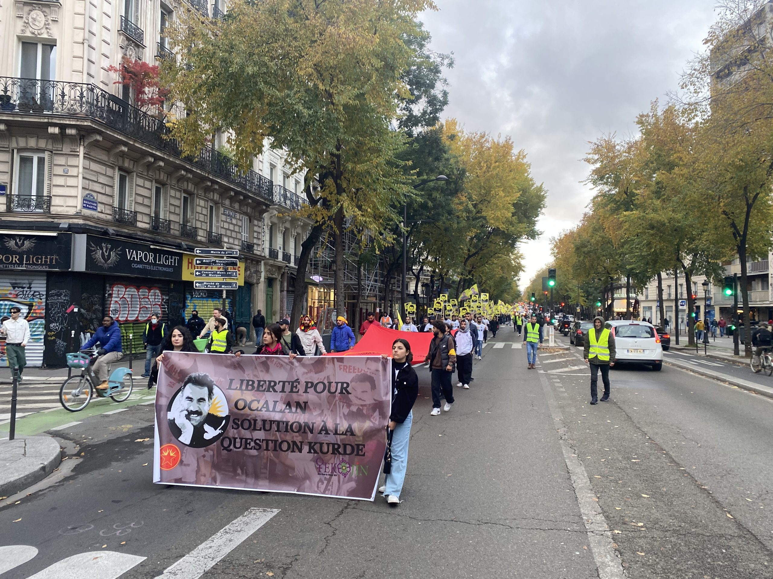 Gençler eylemleri için Gare Du Nord’da bir araya gelerek, Önder APO’nun silüeti ve fiziki özgürlüğünü talep eden slogan yazılı beyaz tişörtler giyip, yürüyüşe başladılar.