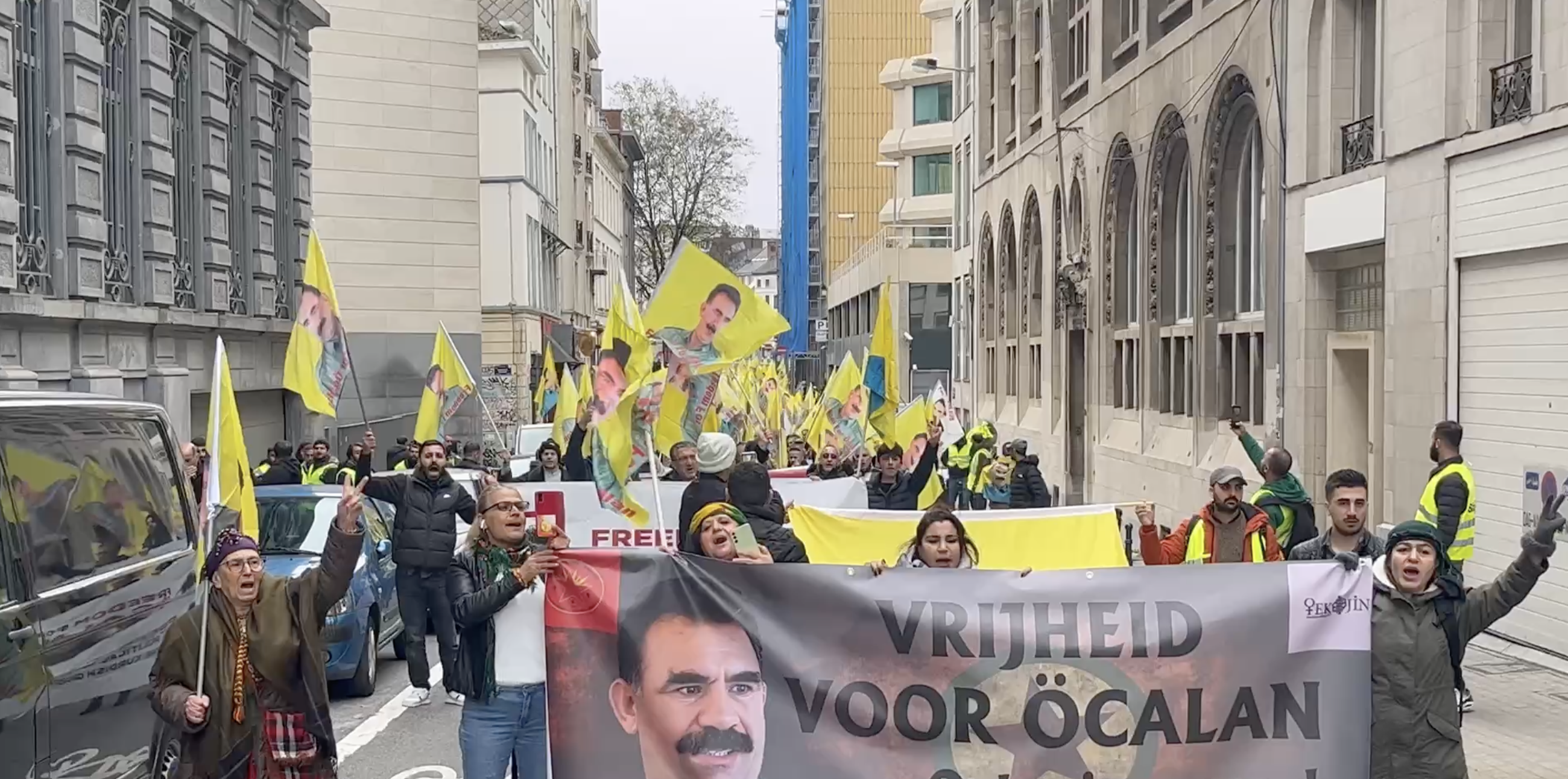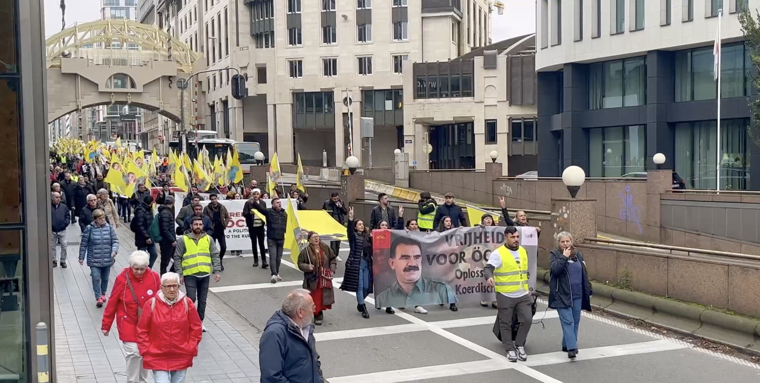 Gençler Önder APO’nun olduğu bayraklar ve Felemenkçe “Önder APO’ya Özgürlük” yazılı pankartlarla yürüyüşe başladı.