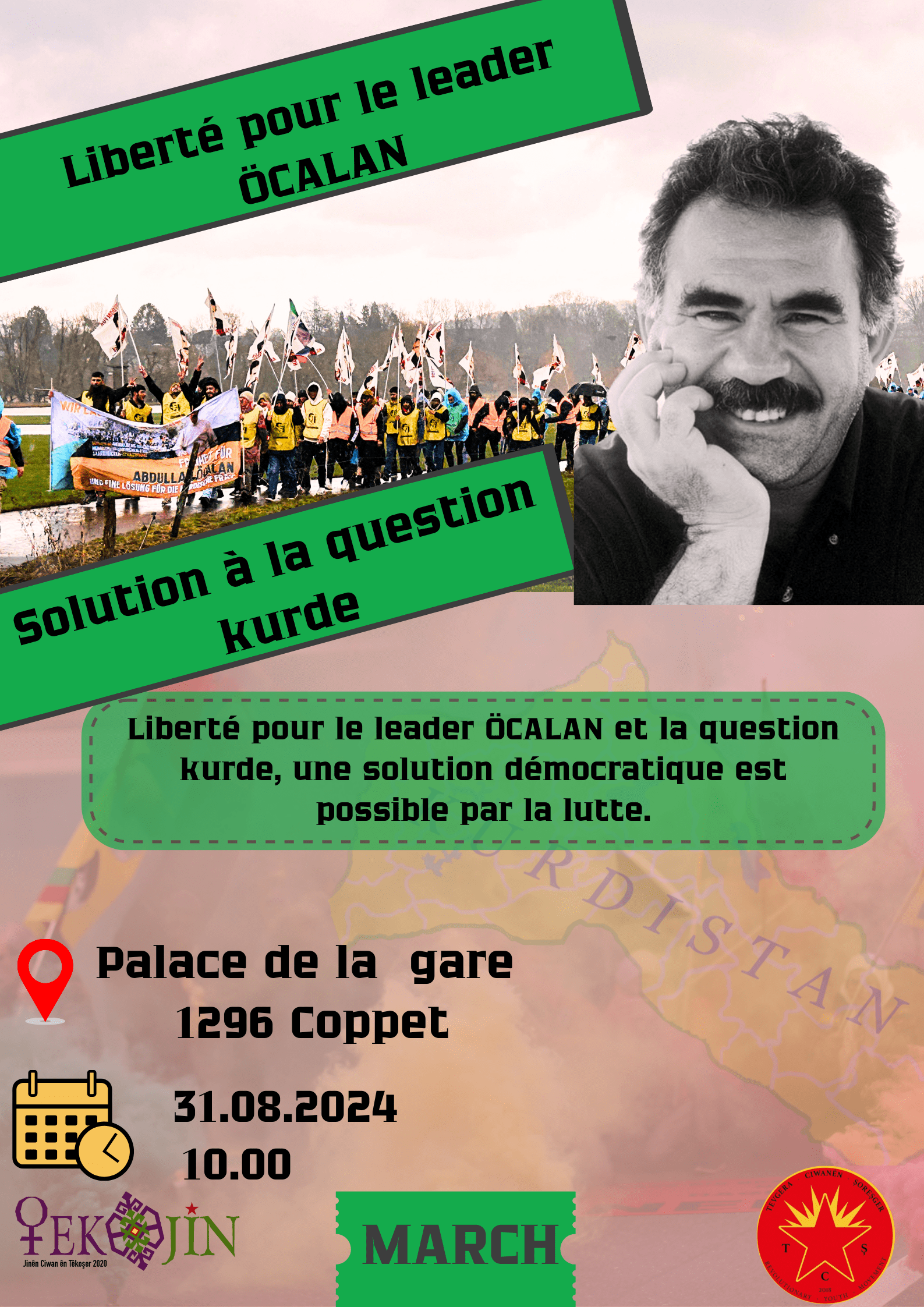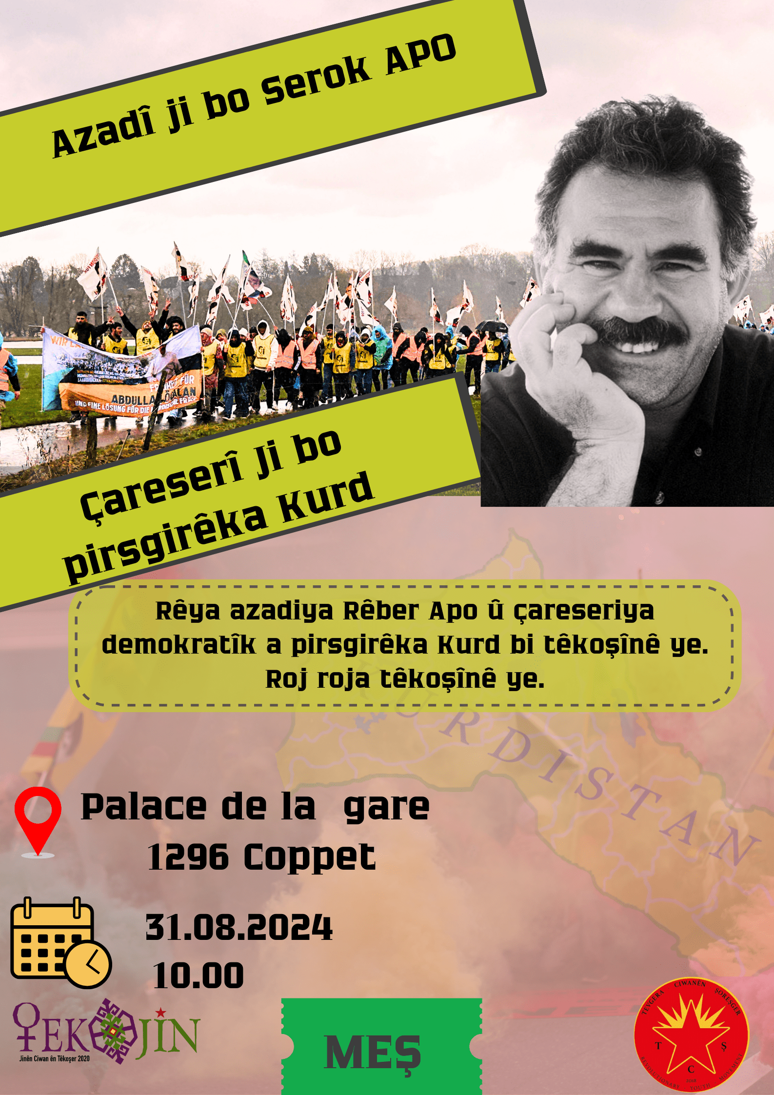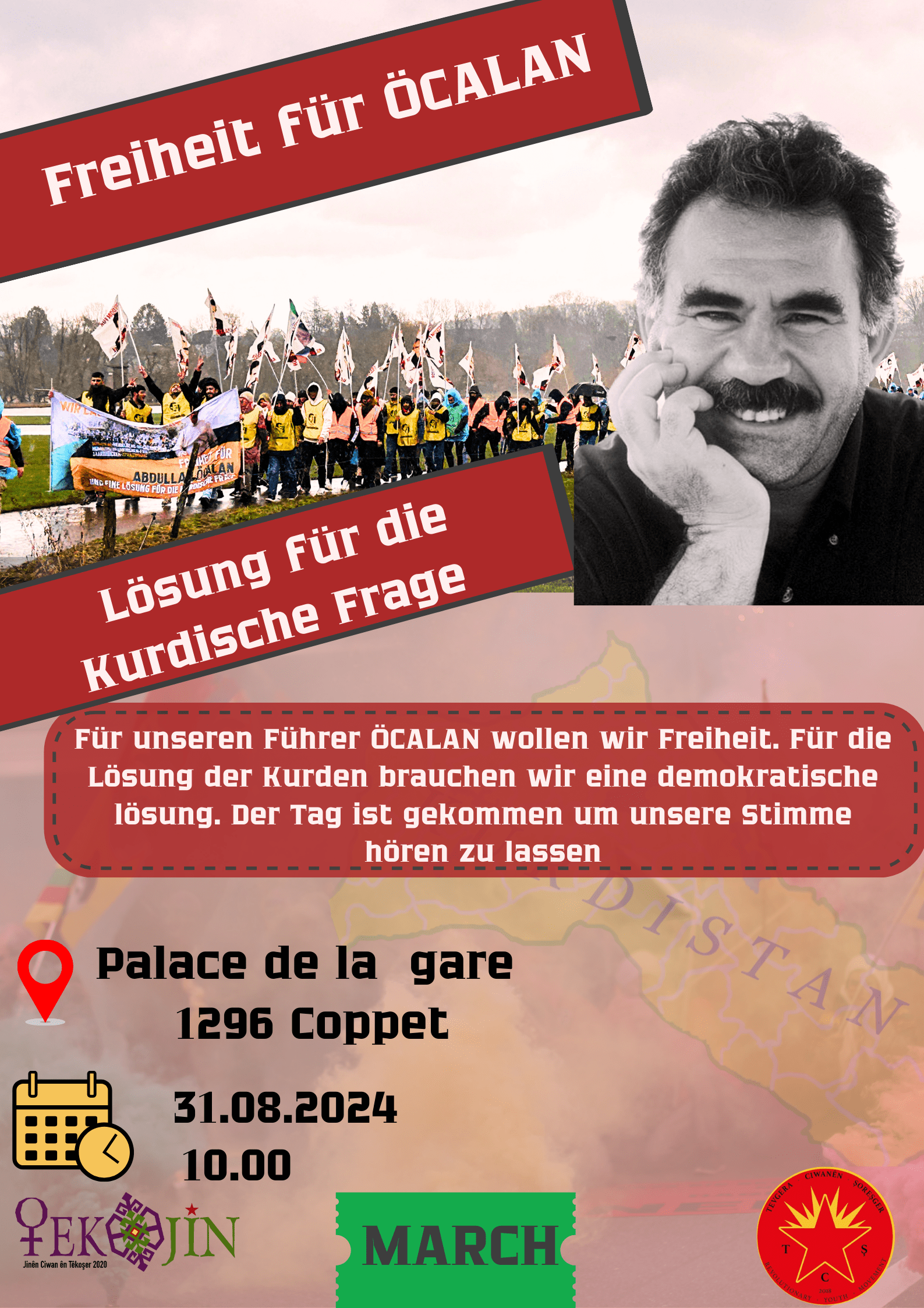 “18 Ekim 2023 de yapılan açıklama ile ‘Önder APO’ya Özgürlük Kürt Sorununa Çözüm’ hamlesine katılma öncülük yapılmak konusunda kararlığını deklere edilmişti. Gelinen aşamada Kurdistan Özgürlük Gerillası ile Önder APO’nun verdiği mücadele hamleye kazandırdığı ivme ve güç ile bugün bütün dünyaya rüştünü kanıtladı. Gençlik olarak Önder APO’nun bize öğrettiklerini ortaya koymanın ve özgürlük için çabalayan bir gençliğin durdurulmasının zor olacağını göstermenin anıdır. Gençlik en büyük öncü güçtür. Bu güç ile hamleyi başarıya ulaştıracağımızı göstermenin zamanıdır. Kesintisiz 26 yıldır 12 m2 bir odada direniş veren Önder APO’dan 42 aydır hiç bir şekilde haber alınamamaktadır. Gün geçmiyor ki yeni bir disiplin cezası ile Önder APO ile halklar arasındaki iletişimi kesilmesin. Dünyada eşi benzeri görülmeyen bu sistematik psikolojik işkence ile mutlak tecriti derinleştiren Komplocu güçler ve bunun bekçiliğini yapan TC kafalarını kuma gömmüş deve kuşu misali ortadadırlar. Bunun için TCŞ ve TekoJIN olarak 31 Ağustos günü Lozan’da başlayacak ve Cenevre BM önünde sonlanacak olan bir günlük yürüyüşümüze demokrat kesimi bekliyoruz. Gelin beraber başta Önder APO üzerindeki tecriti teşhir edip, Kurdistan’daki soykırım ve imha politikalarına karşı tepkimizi gösterelim. Bu temelde ‘Önder APO’ya Özgürlük Kürt Sorununa Çözümün’ yolu direniş ve mücadeleden geçer. Gün mücadele ve direnişi büyütme günüdür. 10 Ekim hamlesi ekseninde yapılacak olan bu yürüyüşe başta Kürt gençliği olmak üzere yurtsever halkımız ve mücadeleden yana olan bütün dostlarımızı bekliyoruz.”