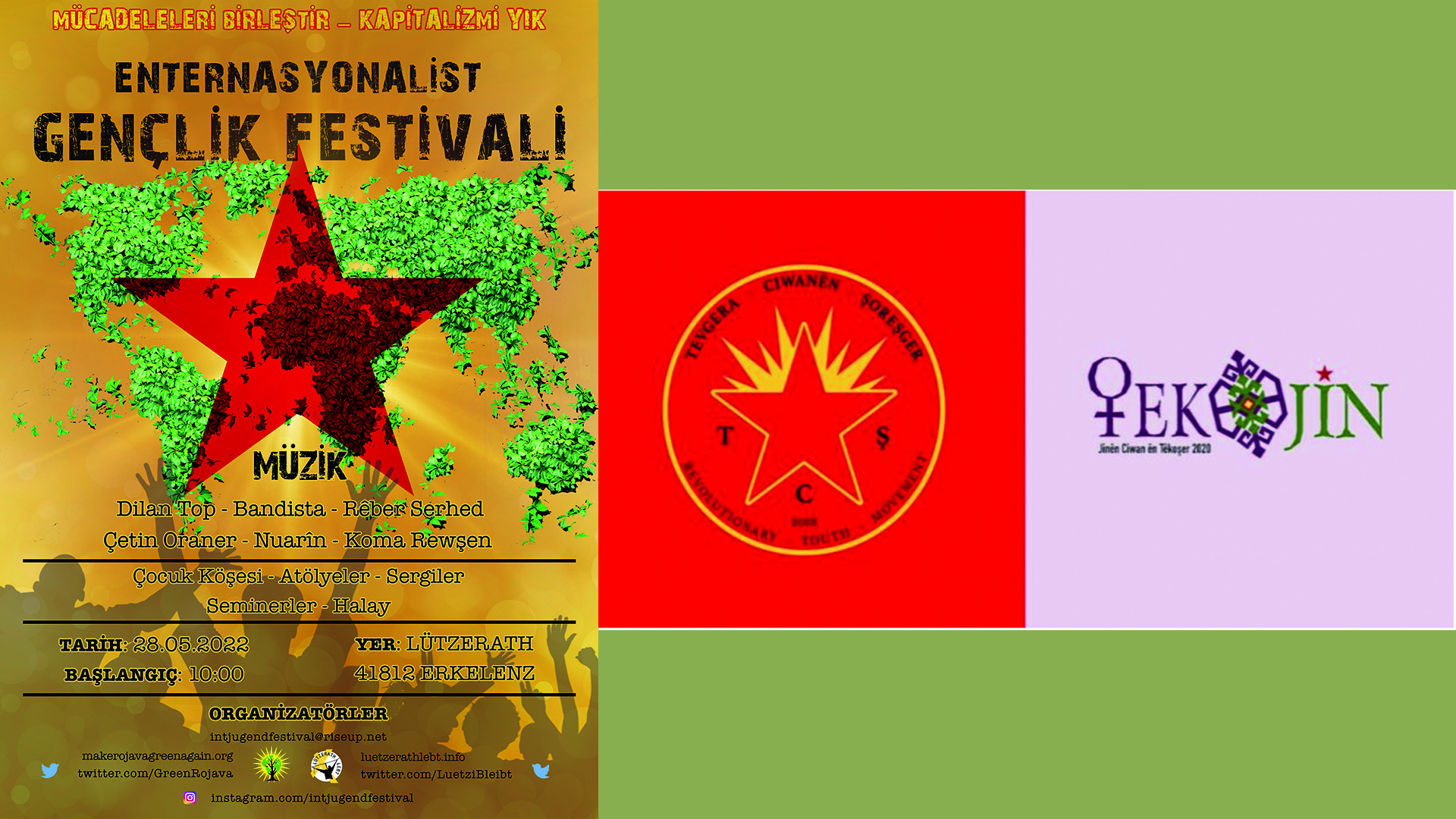 LützerathLebt ve Make Rojava Green Again hareketleri 28 Mayıs’ta Almanya’nın NRW eyaletinde bulunan Lützerath’ta Enternasyonalist Gençlik Festivali’ni düzenleyecekler. Festival “Mücadeleleri birleştir Kapitalizmi yık” şiarıyla gerçekleştirilecektir. Gençlik hareketlerinin kapitalizme karşı ortak bir mücadeleyi geliştirmesi, bu amaçla bir araya gelmesi, halkımızı soykırıma sürüklemek isteyen güçlere karşı verilecek en doğru cevap olacaktır. Bu temelde TCŞ ve TEKO-JIN olarak Almanya’da yaşayan tüm Kürt gençlerini ve genç kadınları, halkımızı ve enternasyonalistleri seferberlik ruhuyla Enternasyonalist Gençlik Festivali’ne katılmaya çağırıyoruz.” denildi.