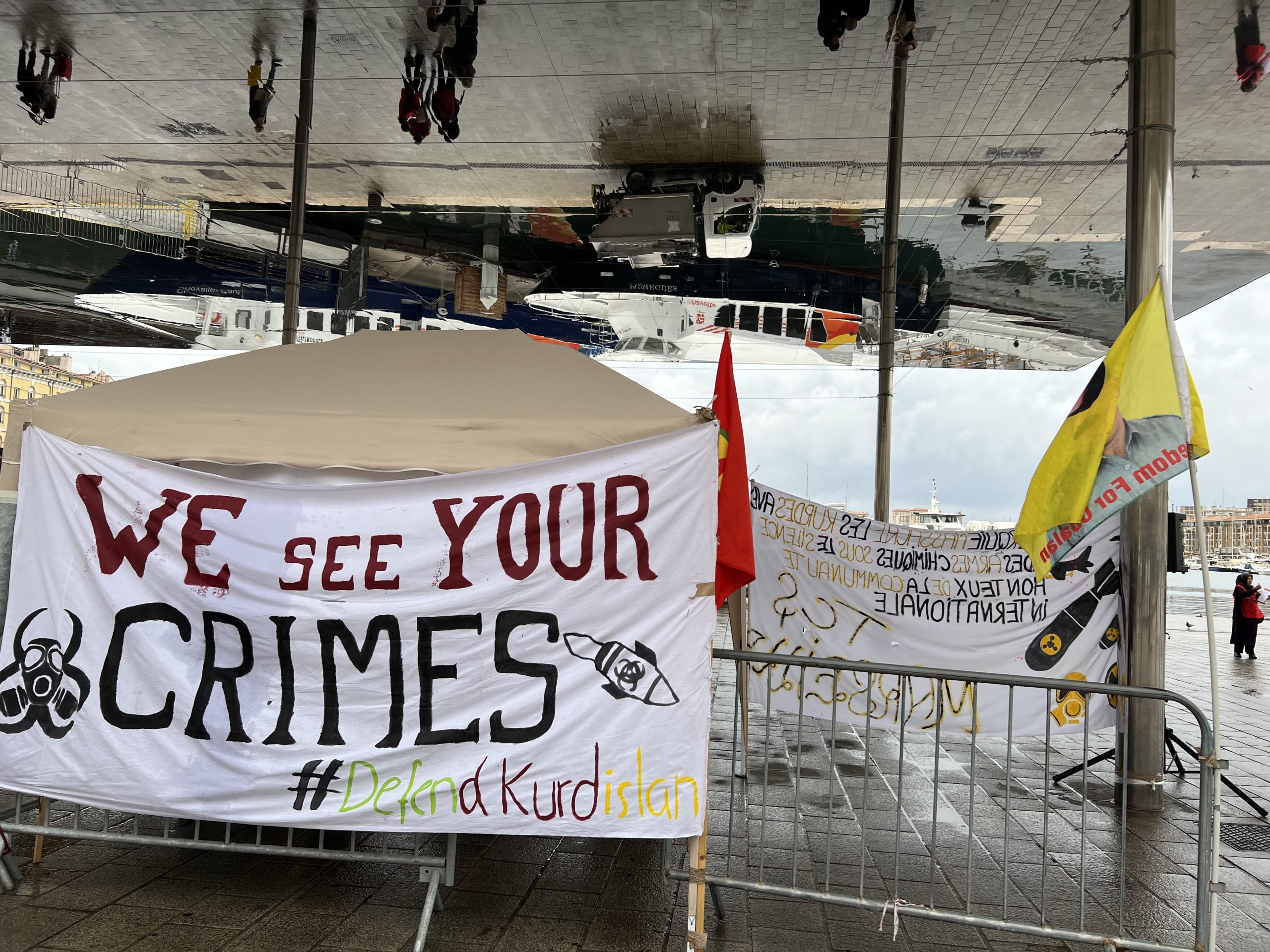 MARSILYA – Tevgera Ciwanen Şoreşger (TCŞ) ve TJK-E, Marsilya’nın Viuex Port Meydanı’nda çadır eyleminin ikinci gününde çalışmalarını sürdürüyor.