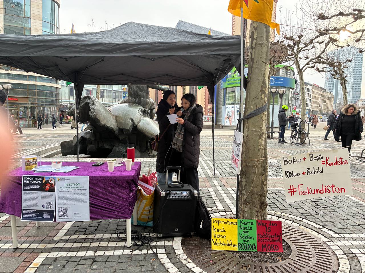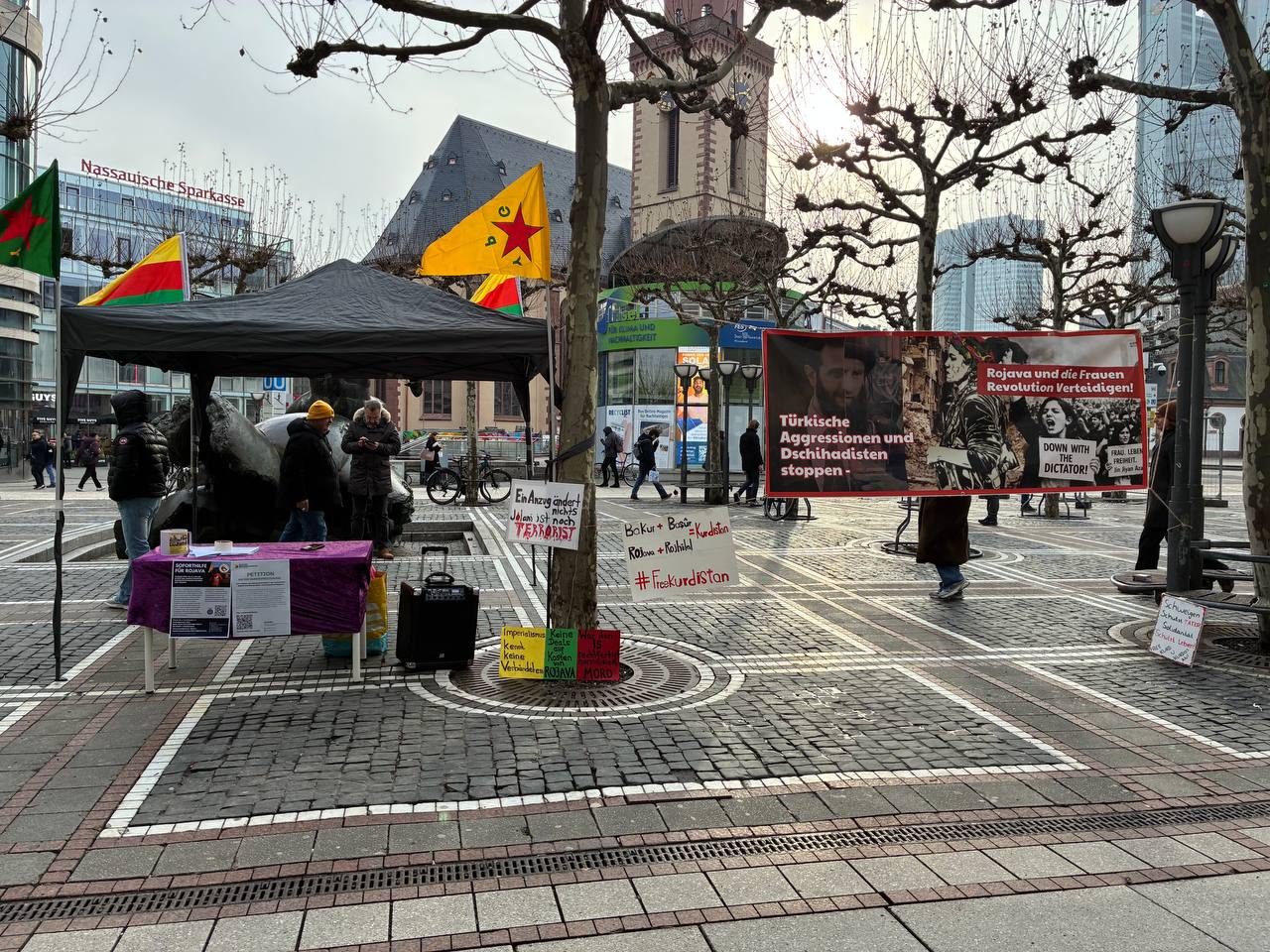 FRANKFURT – TCŞ (Tevgera Ciwanên Şoreşger) ve YJK-E (Yekîtiya Jinên Kurdistanê – Ewropa) aktivistleri, bugün Rojava devrimine ve Kürt halkının kazanımlarına yönelik artan saldırılara karşı bilinçlendirme ve dayanışma çalışması gerçekleştirdi.