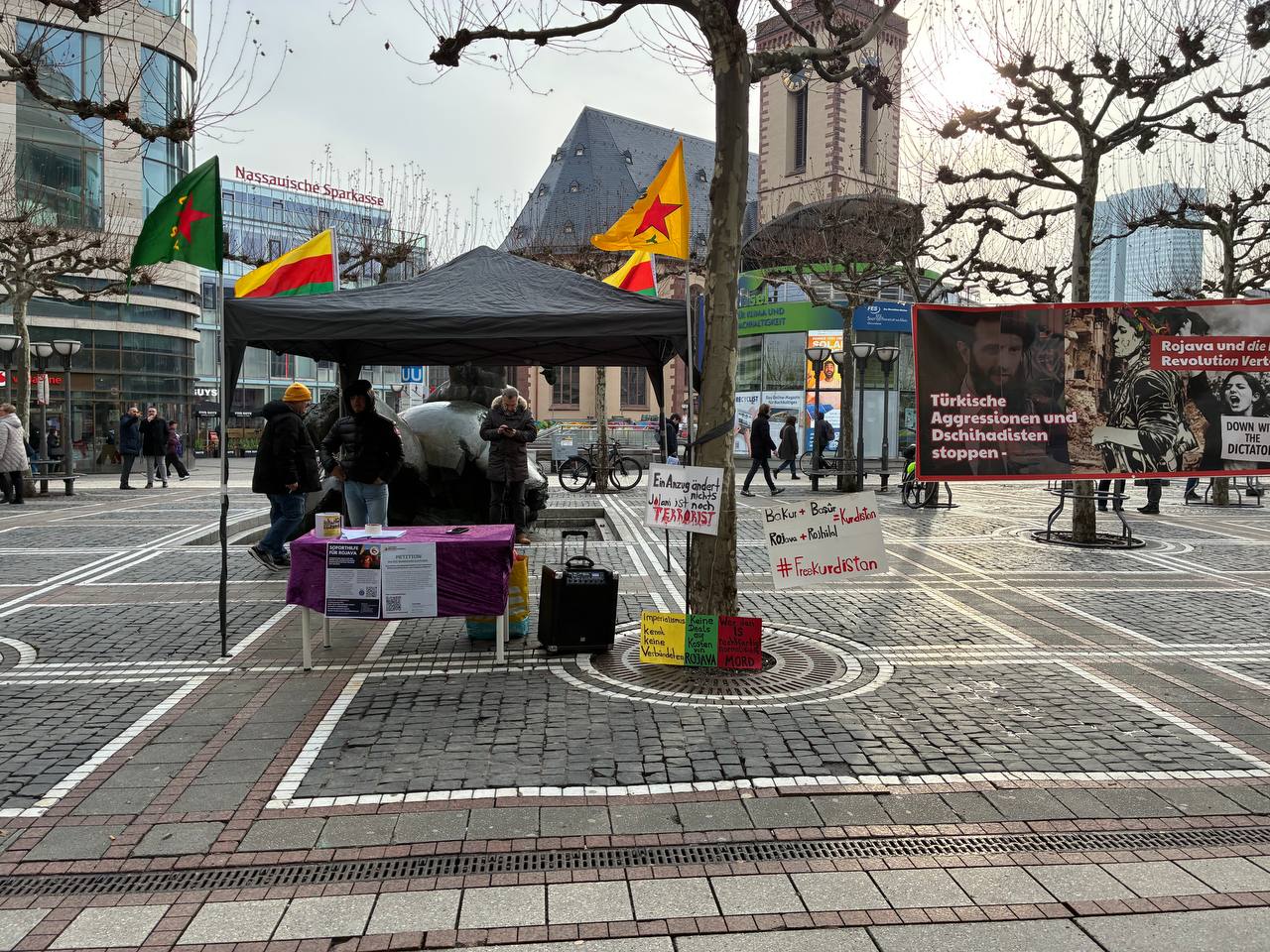 Frankfurt’un en merkezi noktalarından Hauptwache’de kurulan Infostand, saat 14:00’ten 17:00’ye kadar yoğun bir katılım ve ilgiyle devam etti. Yoldaşlar, Rojava’da kadın devriminin kazanımları, demokratik özerklik deneyimi ve faşist Türk devleti ile bağlı çetelerin saldırılarına karşı yürütülen direniş hakkında kapsamlı bilgi verdi.