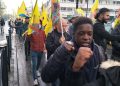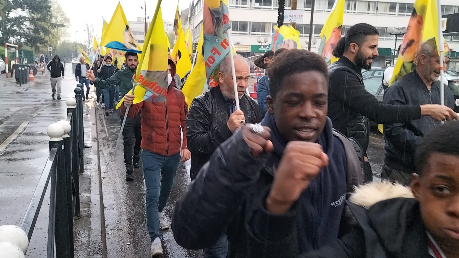 Yağmurlu havaya rağmen Grigny banliyösünde gerçekleştirilen yürüyüşe onlarca genç ve enternasyonalistler katılım sağladı.