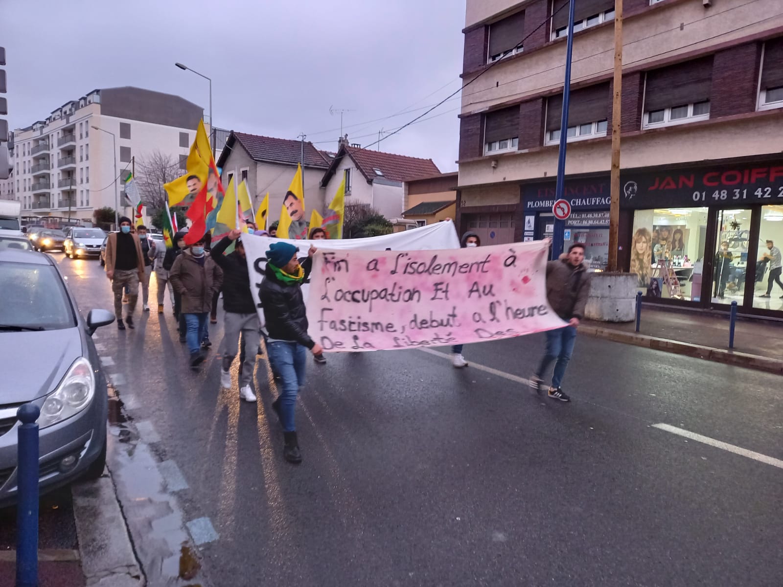 “Tecride, Faşizme, İşgale Son – Bi Hev Re Serhildan” şiarıyla düzenlenen eylem, Drancy’nin Henri Barbusse sokağında saat 17’de başladı. Önder Öcalan’ın posterleri ile PKK ve KCK bayraklarının açıldığı eylemde Fransızca, “Tecride, Faşizme, İşgale Son – Şimdi Özgürlük Zamanı” yazılı pankart taşındı.