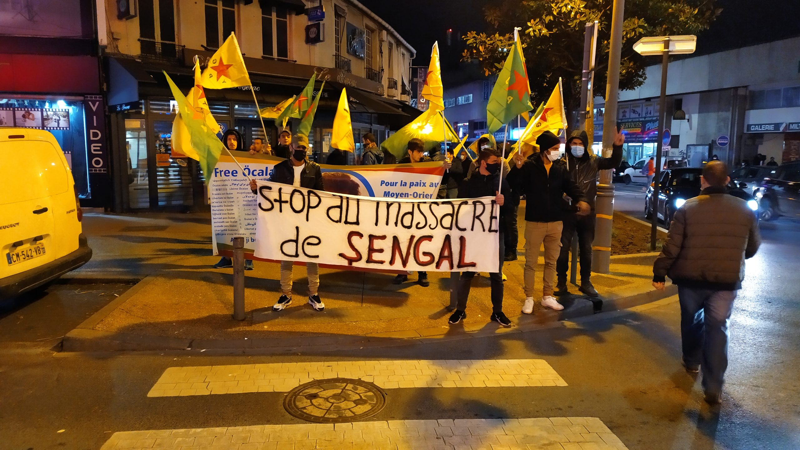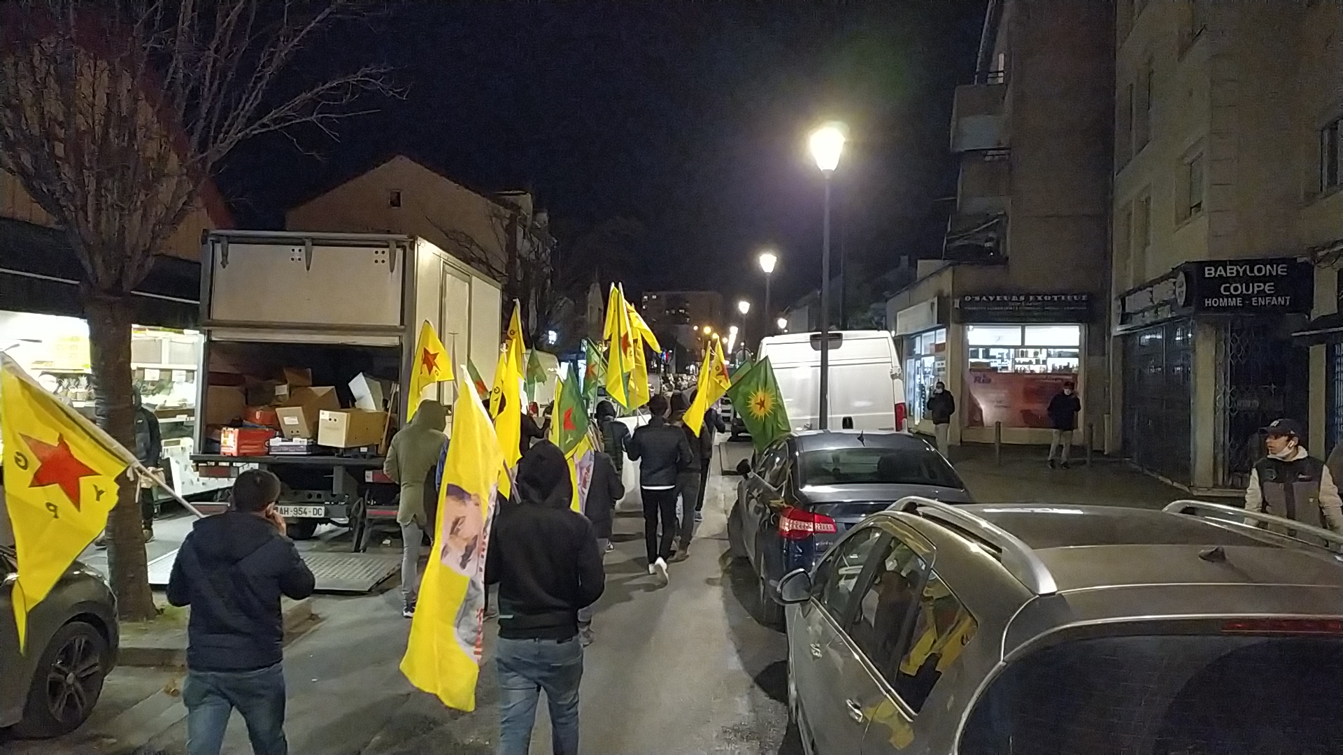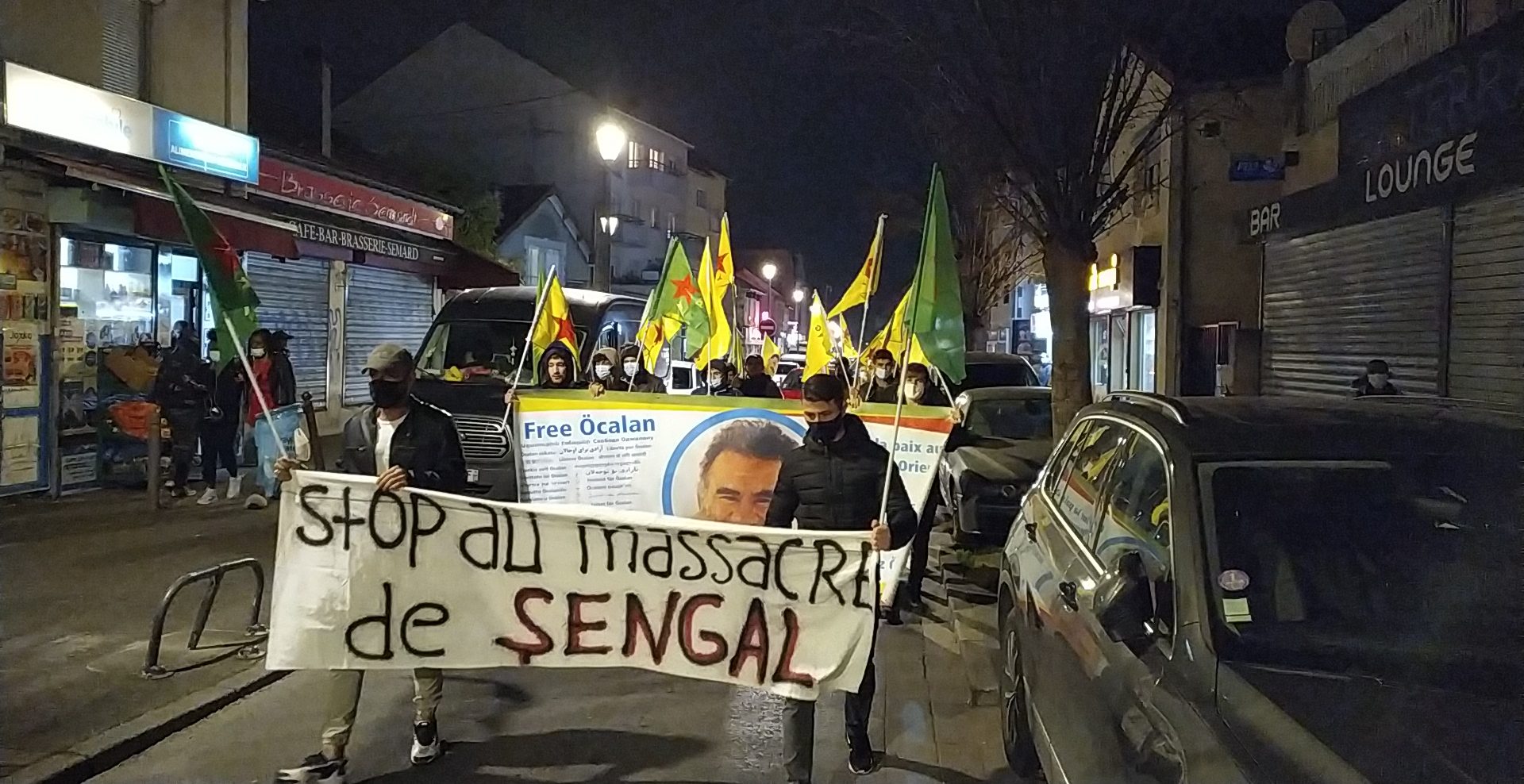 Saat 19’da tren garı önünden yürüyüşlerine başlayan gençler Fransızca, “Şengal’deki Katliamı Durdurun” ve birçok dile yazılmış “Öcalan’a Özgürlük” pankartlarını açtılar. Sık sık Fransızca ve Kürtçe sloganlar ile KDP’yi protesto eden gençler, yaptıkları açıklamada 75’nci fermana karşı Şengal halkının yanında olduklarını belirttiler.