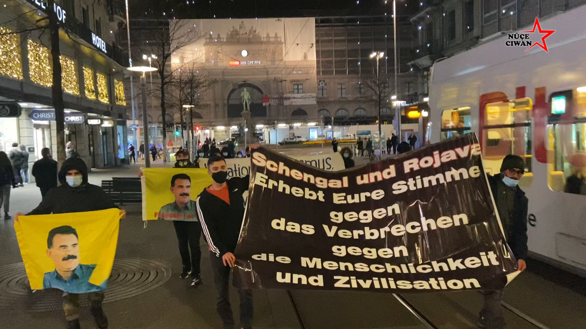 Almanca, “Şengal ve Rojava’daki insanlığa ve uygarlığa karşı işlenen suçlara karşı sesinizi yükseltin” yazılı pankartı açan gençler, Zürih merkez tren istasyonu önünde saat 19’da yürüyüşe başladı. Halklar Önderi Abdullah Öcalan’ın posterlerini taşıyan gençler, sıklıkla “Bijî Berxwedana Şengalê”, “Bimre Îxanet” ve “Freiheit für Öcalan, Frieden in Kurdistan” sloganlarını attılar.
