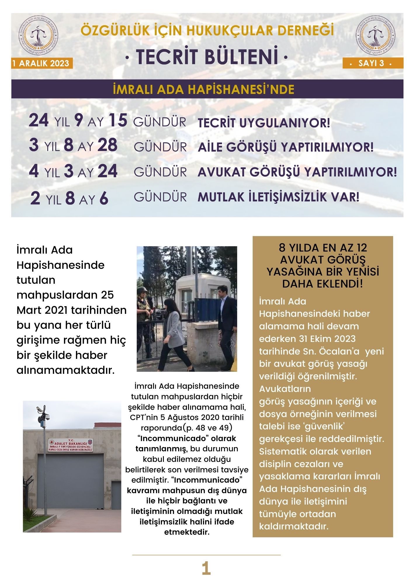 İmralı F Tipi Yüksek Güvenlikli Cezaevi’nde tutulan Önder Apo ile tutsaklar Hamili Yıldırım, Ömer Hayri Konar ve Veysi Aktaş üzerindeki tecride dair kamuoyunu bilgilendirmek amacıyla Özgürlük İçin Hukukçular Derneği (ÖHD) tarafından hazırlanan “Tecrit Bülteni”nin3’üncü sayısı derneğin sanal medya hesabından paylaşıldı.