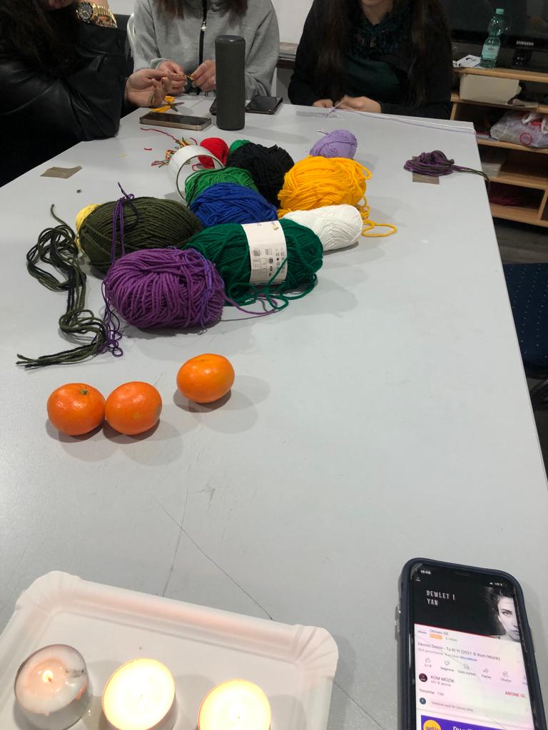 Ardından genç kadınlar şarkılar dinleyip beraber bileklikler ve kitap ayraçları yaptılar.
