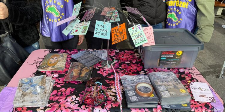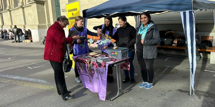 BERN – Bugün İsviçre’nin Bern kentinde TekoJIN üyelerinin girişimiyle bir stant kuruldu. “Jin Jiyan Azadî – Serbixe Azadî” yazılı kartpostallar ve bileklikler satılarak depremzedeler için Kürt yardım kuruluşu Heyva Sor (Kızılay) için para toplandı. İsviçre halkı Kürdistan’daki durum ve kadın özgürlük mücadelesi hakkında bilgilendirildi. TekoJIN’in broşürleri de dağıtıldı.