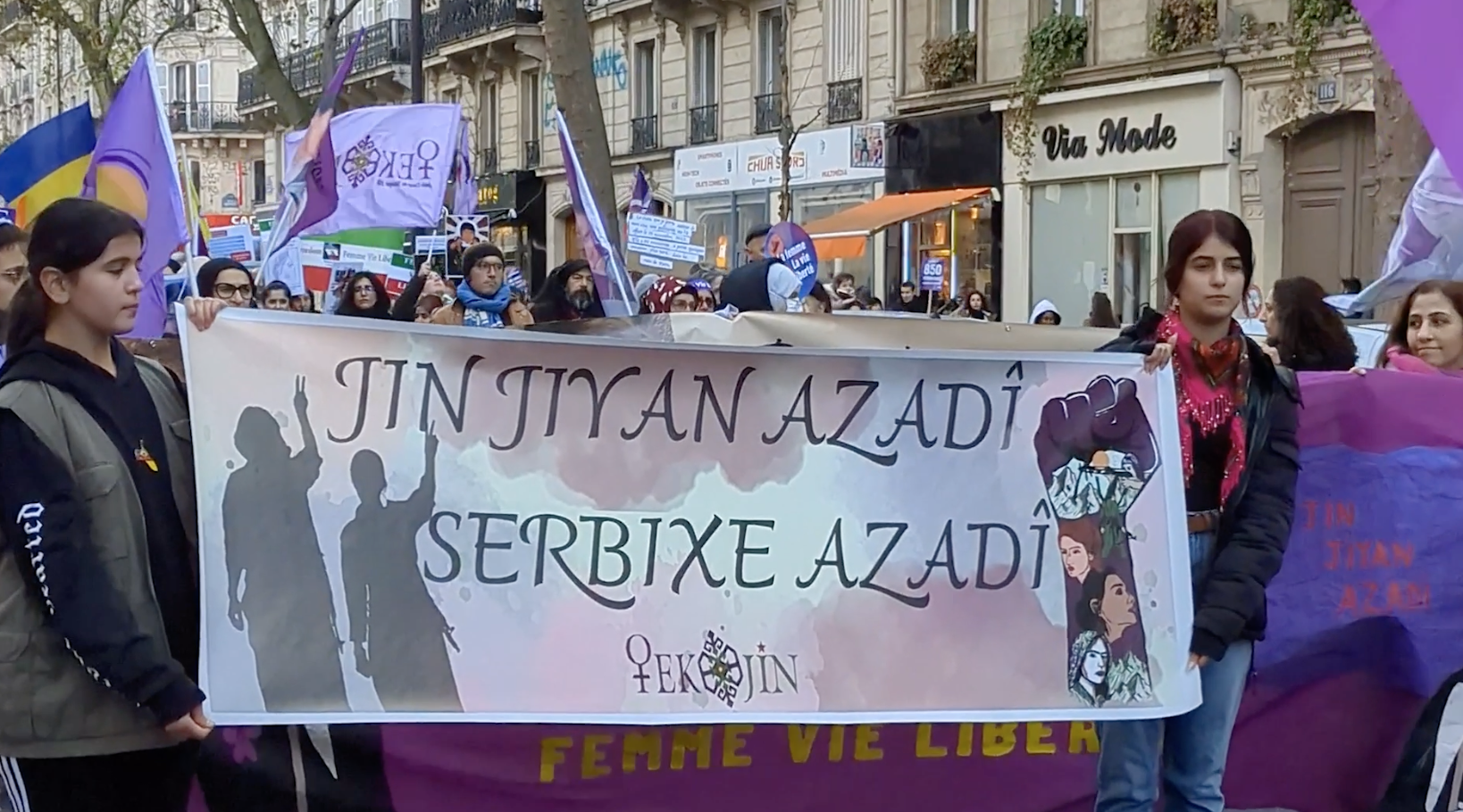 PARİS – Fransa’nın başkenti Paris’te bir araya gelen TekoJIN (Jinên Ciwan ên Têkoşer) üyesi genç kadınlar, gençlik korteji ile eyleme katıldı. Oluşturulan gençlik kortejinde ‘’Jin Jiyan Azadî Serbixe Azadî’’ pankartı ile yürüyen genç kadınlar, Özgür Kadın Çizgisi’ni oluşturan Önder APO’nun fiziki özgürlüğü için her zaman mücadele içerisinde olacaklarını belirttiler.