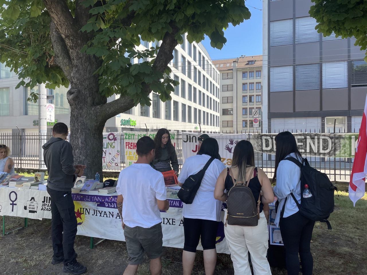 İsviçre'nin Zürih kentinde TekoJIN üyeleri Jin Jiyan Azadî Serbixe Azadî hamlesi kapsamında stand açtı.