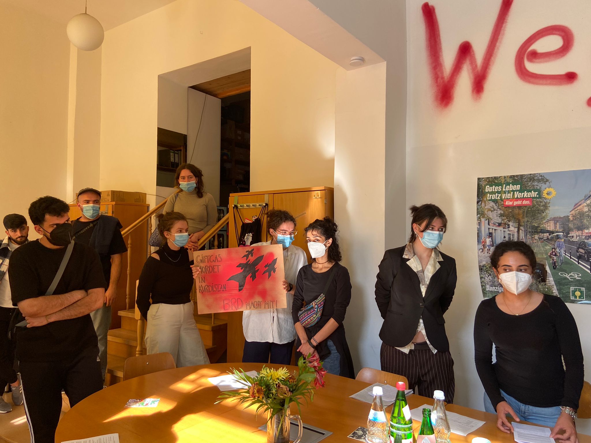 BERLİN – Bugün Berlin’de TekoJIN ve enternasyonalist genç kadınlar öncülüğünde Alman Parlementosu Yeşiller Partisi Milletvekilli Canan Bayram´ın bürosunda bir işgal eylemi gerçekleştirildi. Genç kadınlar bu eylemde Medya Savunma Alanları’nda TC faşist devletinin gerillaya dönük  işgal ve soykırım saldırılarını  ve hukuksuz bir şekilde kimyasal ve nükleer silah kullanılmasına dikkat çekerek Kamuoyunun ve NATO devletlerinin sessizliğinin kırılması gerektiğini belirtti.