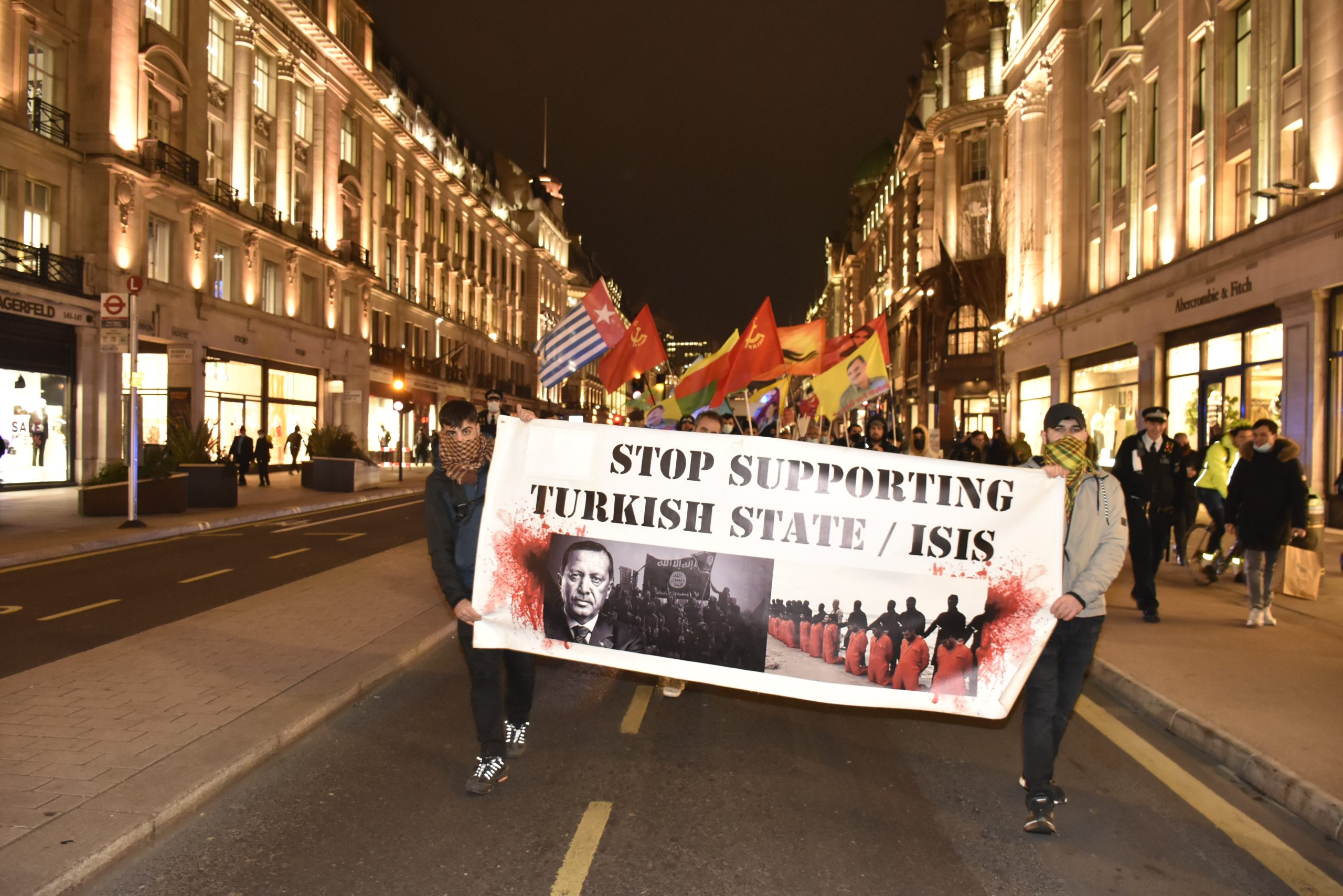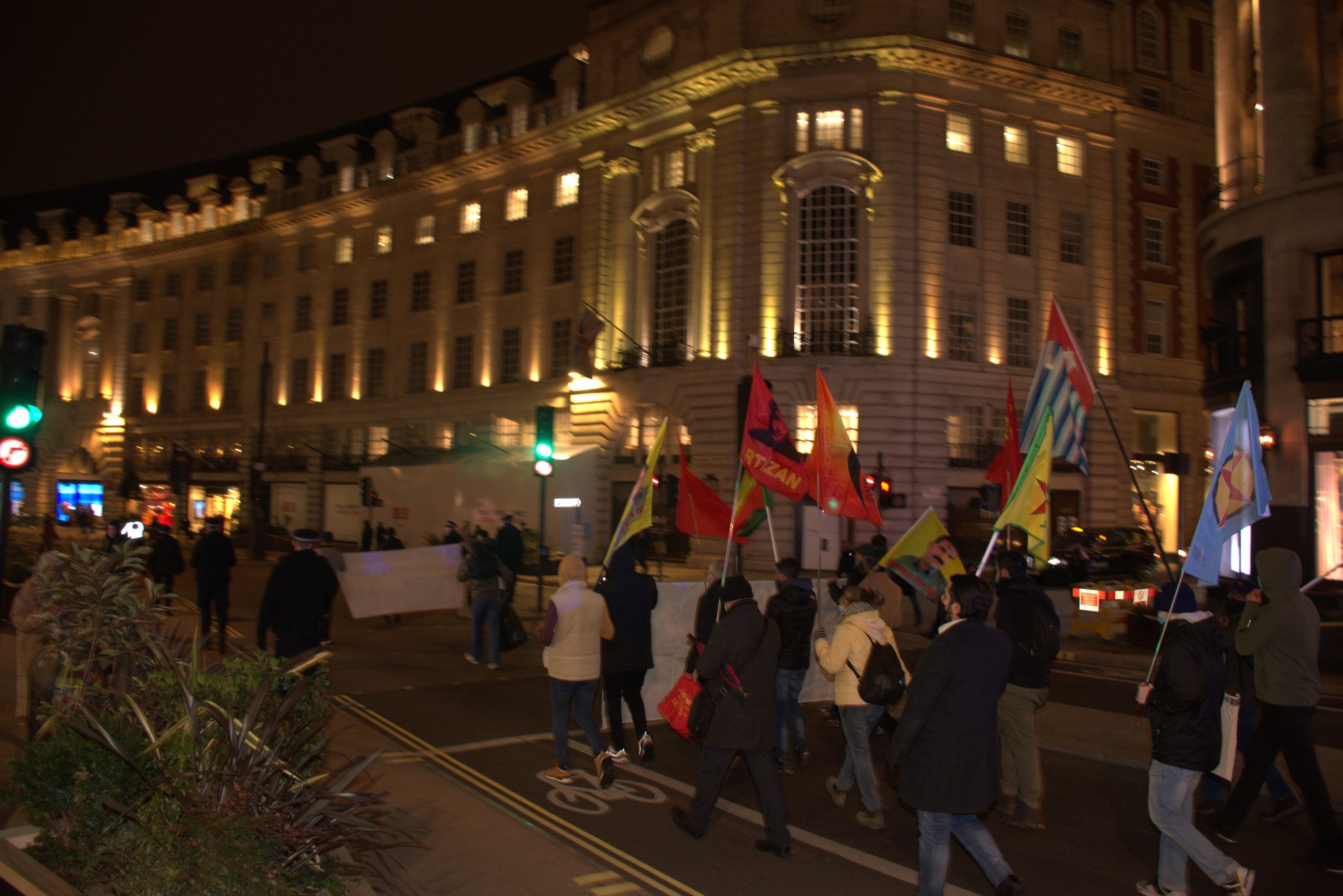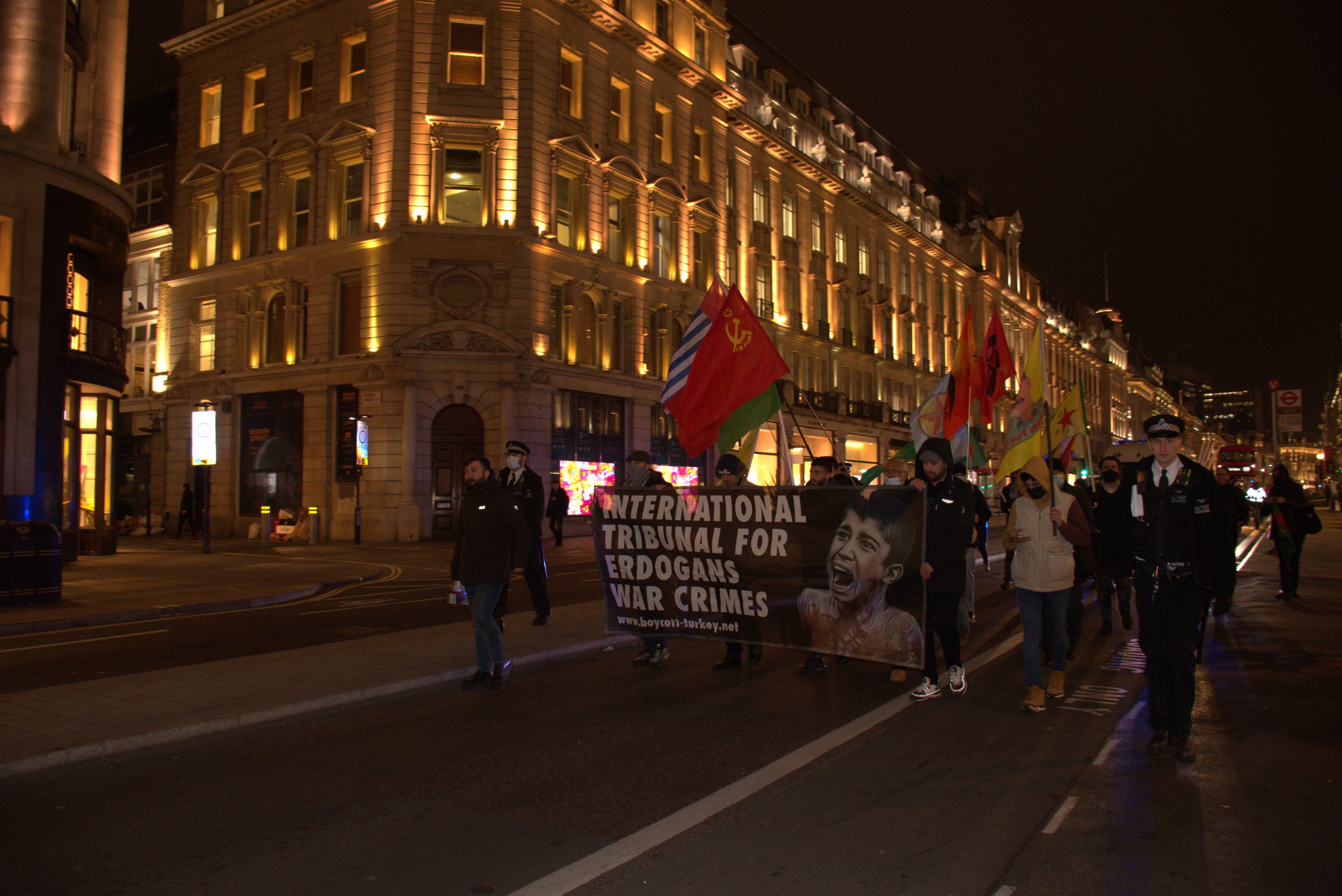 “Werin Cenga Azadiyê” şiarıyla bir araya gelen kitle Oxford Circus Underground Station’dan yürüyüşlerine başladılar. Yaklaşık bir saat süren yürüyüş ardından Piccadilly Circus Meydanı’nda Kürdistan Devrim Şehitleri anısına bir dakikalık saygı duruşunun ardından TCŞ adına bir açıklama yapıldı. Açıklamada gençler tarafından şunlara vurgu yapıldı; “Evrensel bir önder olan Önder Öcalan’ın fiziki olarak özgürleşmesinin zamanı gelmiştir. Bunun için her zaman alanlarda olacağız. Ve şu anda Türkiye’nin her türlü NATO desteğiyle Kürdistan’da sürdürdüğü işgal ve soykırım saldırılarına karşı alanlarda olacağız”