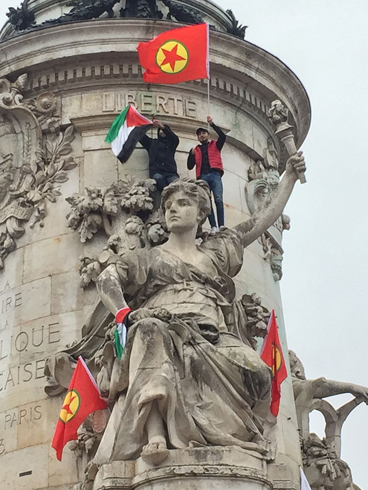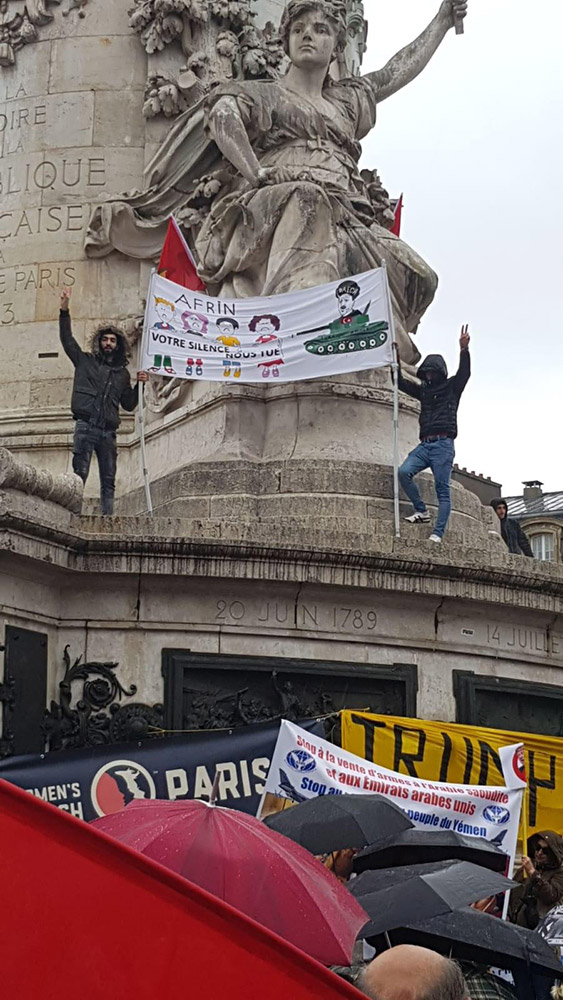 PARİS – Dün Fransa’nın başkenti Paris’te I. Dünya Savaşı’nın sona ermesinin yıldönümünde, savaşın sorumluları olan devlet başkanlar bir araya geldi. Günümüzün en büyük savaş suçlularından Erdoğan’ın da davet edilmesine karşı Paris’te eylemler düzenlendi. Binlerce kişinin katıldığı mitinge birçok örgüt destek verdi. Kürdistanlı gençler miting boyunca Halklar Önderi Öcalan’ın fiziksel özgürlüğünü talep eden sloganlar attı. Eyleme katılan gençlik hareketleri mitingde ortak bir pankart da açtı.