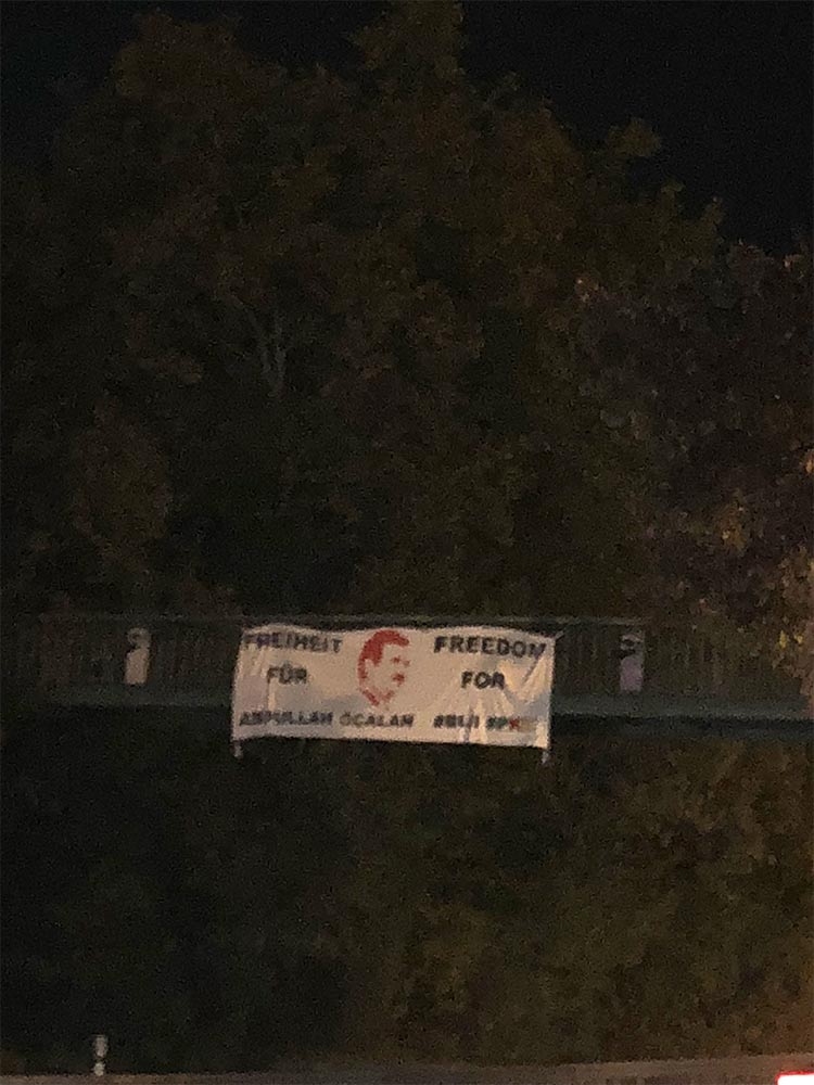 Frankfurt’ta Tevgera Ciwanên Şoreşger tarafından bir köprüye üzerinde “Önder APO’ya özgürlük” yazan bir pankart asıldı. Yapılan açıklamada “Rojava, Rêber APO’nun bize en büyük armağanıdır. Rojava’yı savunmak biz Kürt gençleri için bir onur meselesidir” dendi.