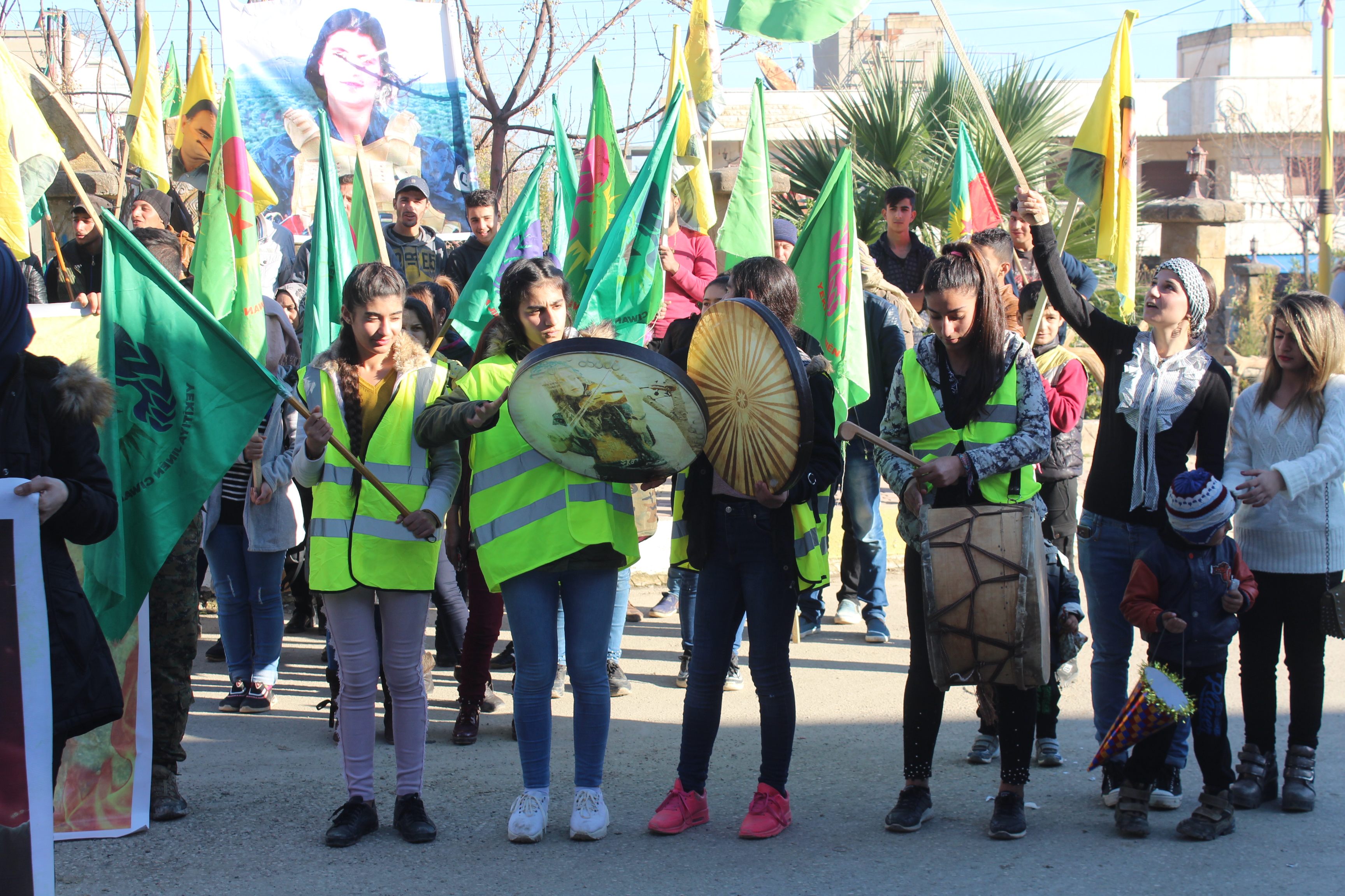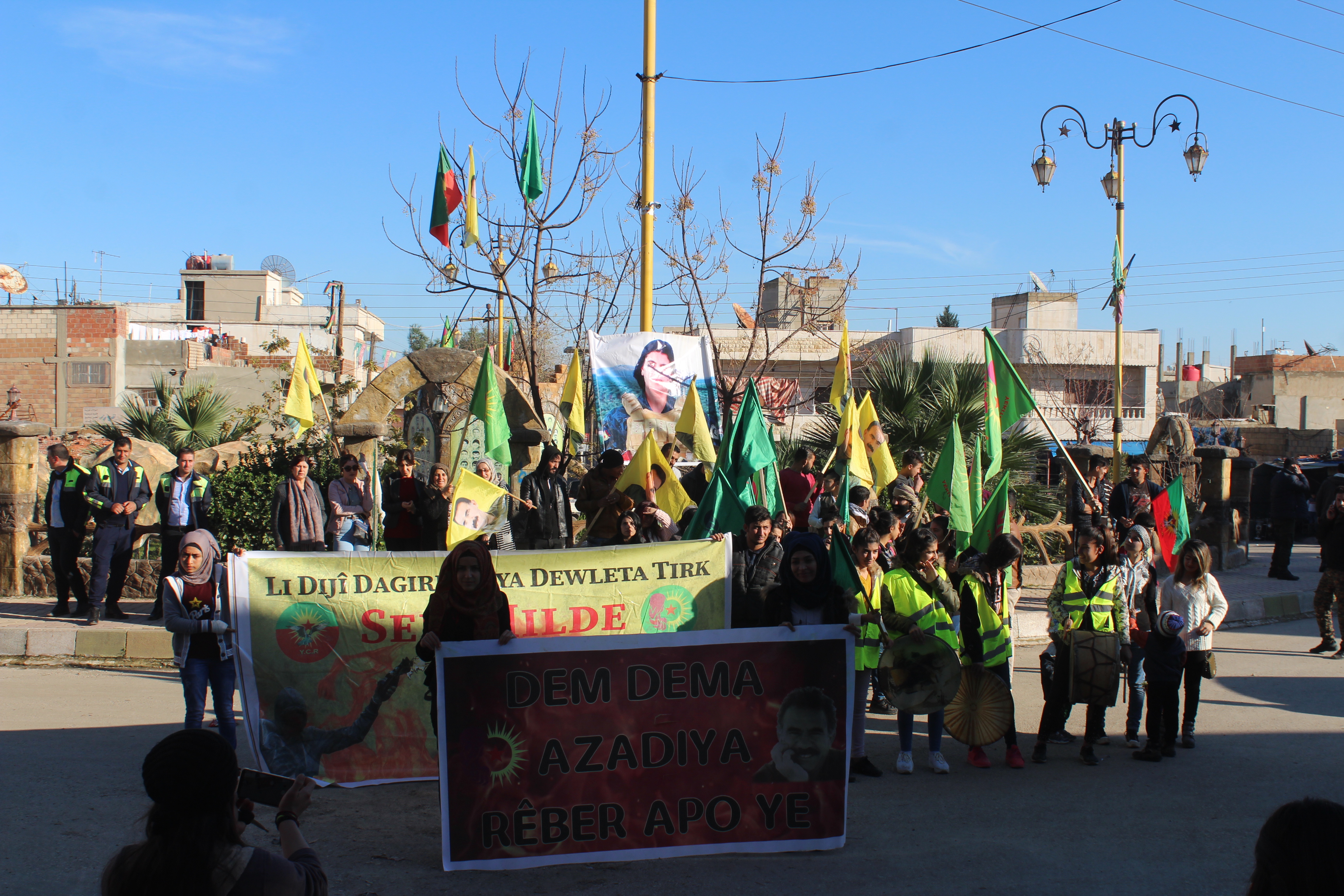 Tevgera Ciwanên Şoreşger ê Suriye ve Genç Kadın Birliği Dêrik şehrinde işgalci Türk devletinin Maxmur, Şengal ve Rojava saldırılarını protesto etti.