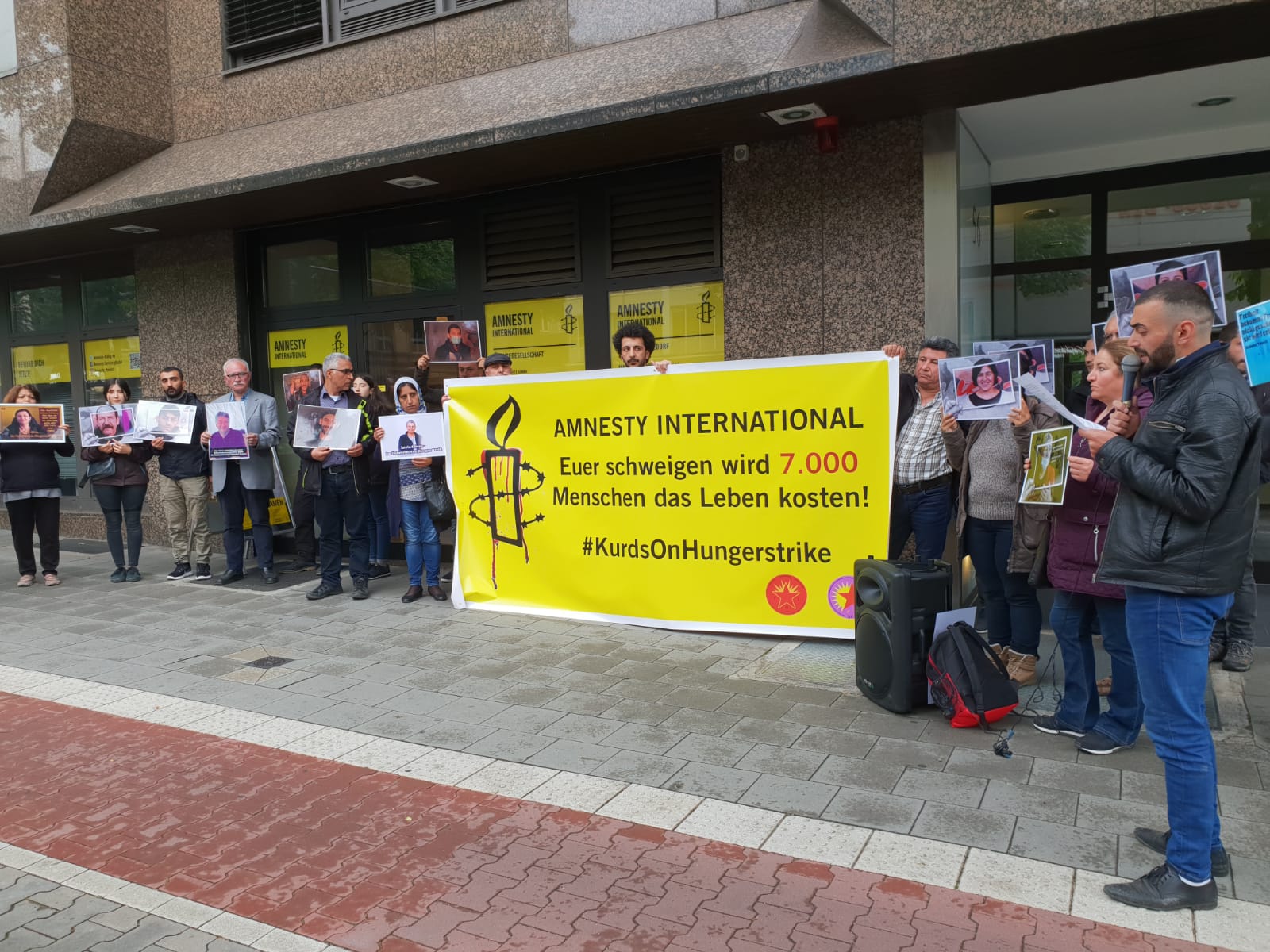 Eylem sırasında Kürdistanlılar “Bijî Serok APO” ve “Bijî berxwedana Leyla” sloganları attı. TCŞ ve Jinên Ciwan ên Azad (JCA – Özgür Genç Kadınlar) tarafından üzerinde Almanca “Uluslararası Af Örgütü – Sizin sessizliğiniz 7000 insanın yaşamına mal olacak!” yazan bir pankart açıldı. Af Örgütü önünde sessizliği protesto eylemine katılan Kürdistanlılar süresiz-dönüşümsüz açlık grevi eylemcilerinin posterlerini taşıdılar. Yoldan geçenlere dağıtmak üzere hazırlanan bildiri eylem boyunca aralıklarla megafondan okundu.