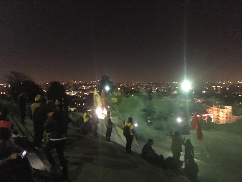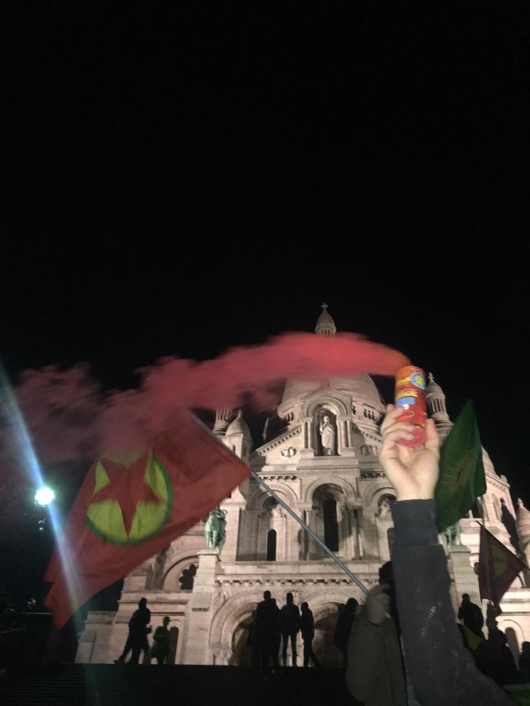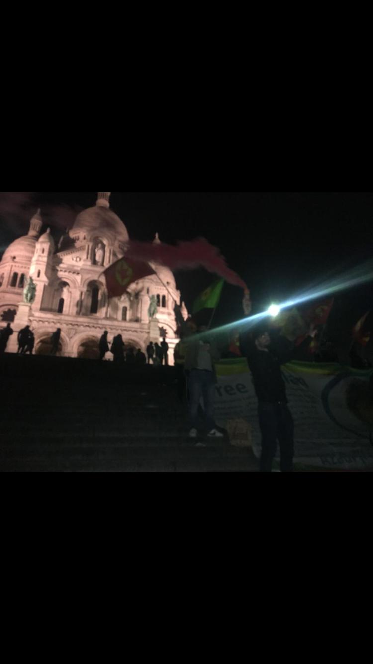 Paris’in en merkezi ve turistik yerlerinden biri olan Sacré Coeur’de bir araya gelen gençler ve genç kadınlar, üzerinde birçok dilde “Öcalan’a özgürlük” yazan dev bir pankart açtı. Çok sayıda turistin de bulunduğu Sacré Coeur merdivenlerinde ayrıca PKK ve Halklar Önderi Abdullah Öcalan’ın bayrakları da açıldı. Tarihi kilisenin dört bir yanında Yeşil, Kırmızı, Sarı ve Mor renklerdeki dumanları da kullanan gençlerin eylemine birçok turist alkış ve sloganlarla destek verdi. Gençler ve genç kadınlar eylem boyunca Fransızca “Öcalan’a özgürlük” sloganları attı ve Çerxa Şoreşê marşını söyledi. Ayrıca eylem sırasında Halklar Önderi Abdullah Öcalan’a uygulanan tecrit işkencesi ve süresiz dönüşümsüz açlık grevleri üzerine Fransızca hazırladıkları bildirileri dağıttı. Eylem “Bijî Serok APO” sloganları ile sona erdi.