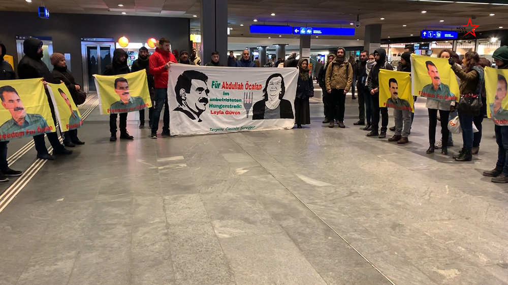 BERN – Tevgera Ciwanên Şoreşger aktivisti gençler bu akşam saatlerinde İsviçre’nin Bern kantonunda bir sivil itaatsizlik eylemi gerçekleştirdi. Yaklaşık 20 kişi, Bern merkez tren istasyonunda başlayan mitingin ardından pankart ve bayraklarıyla istasyonun içine girdi ve eylemlerini burada sürdürdü. Gençler, Almanca hazırladıkları bir pankarta “Leyla Güven: Abdullah Öcalan için süresiz açlık grevinde” yazdı, Halklar Önderi Abdullah Öcalan ve Leyla Güven’in siluetlerini de pankarta boyadı. Eylem boyunca Halklar Önderi Abdullah Öcalan’ın bayrakları taşındı ve Almanca “Yaşasın Öcalan” ve “Öcalan’a özgürlük, Kürdistan’a barış” gibi sloganlar atıldı.