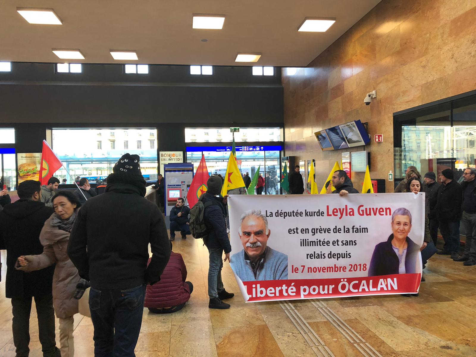 CENEVRE – Tevgera Ciwanên Şoreşger aktivistleri tarafından merkez tren istasyonu içinde bir sivil itaatsizlik eylemi gerçekleştirildi. Gençler Fransızca “Bir Milletvekili, Leyla Güven 7 Kasım 2018 tarihinden beri Öcalan’a yönelik tecride karşı süresiz ve dönüşümsüz açlık grevinde” yazan bir pankart açıldı. Leyla Güven öncülüğünde başlatılan Strasbourg, Hewler, Galler, sömürge zindanları ve giderek dünyanın birçok yerinde sürdürülen açlık grevlerine dikkat çekilen eylemde Fransızca bildiriler dağıtıldı.