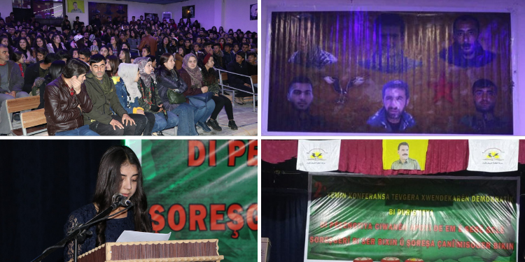 400 öğrencinin ve Bakur û Rojhilata Suriye Bölgesi Özerk Yönetimi temsilcilerinin katıldığı konferans salonu Önder Öcalan ve şehitlerin resimleri, Önder Abdullah Öcalan’ın sözleri ile süslendi.