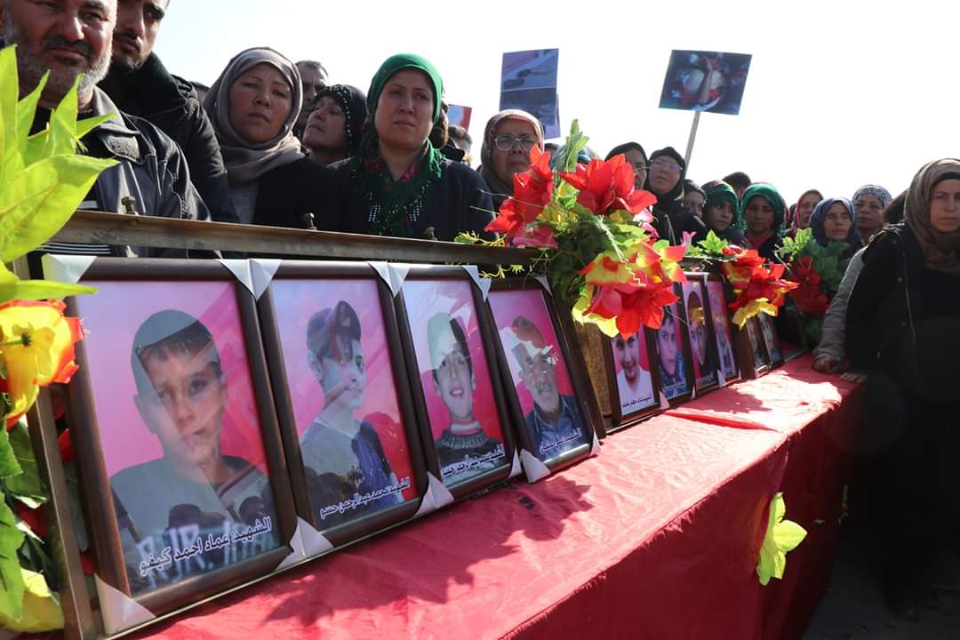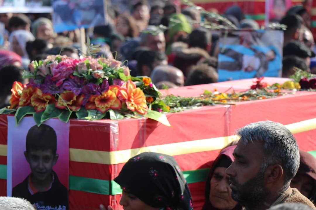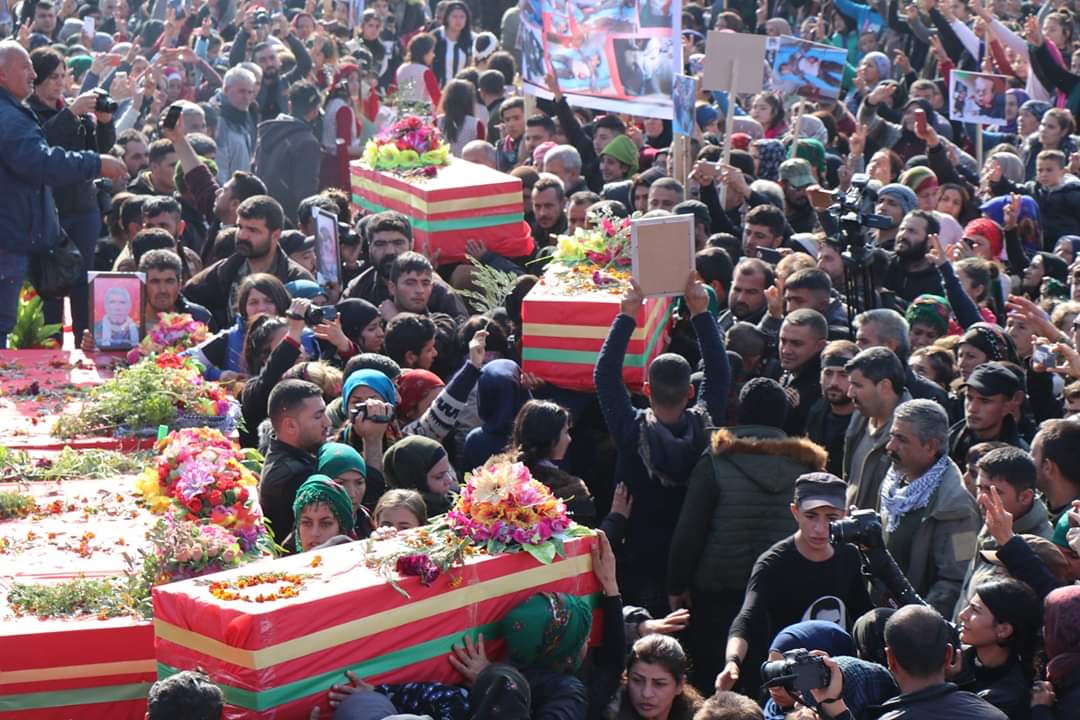 Merasimin sonunda işgalci Türk devleti tarafından 2 Aralık Pazartesi günü hunharca katledilen 8’i çocuk 10 sivilin cenazeleri zılgıt ve sloganlar eşliğinde son yolculuklarına uğurlandı.
