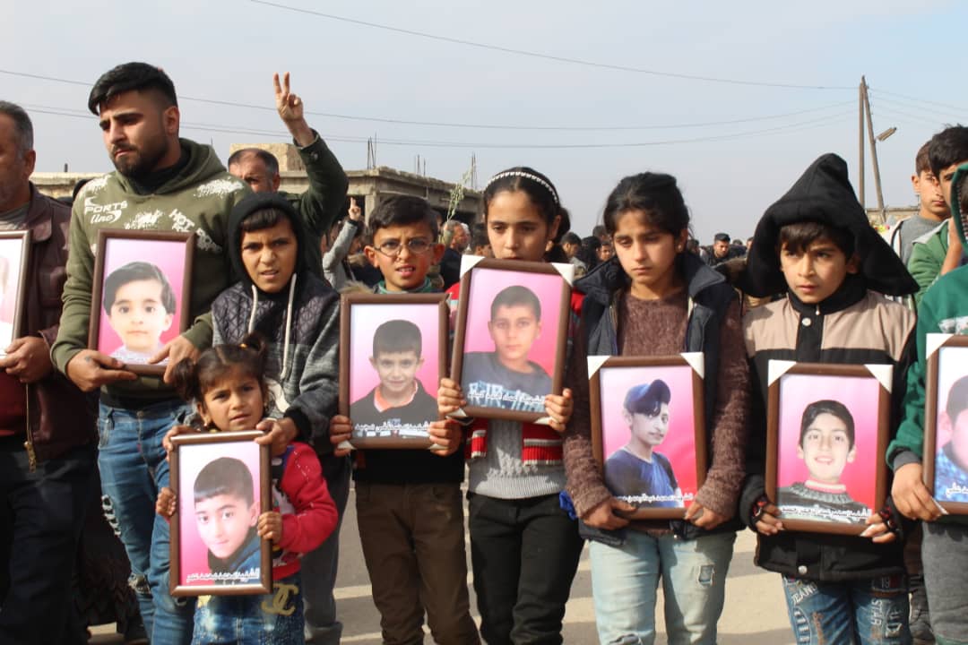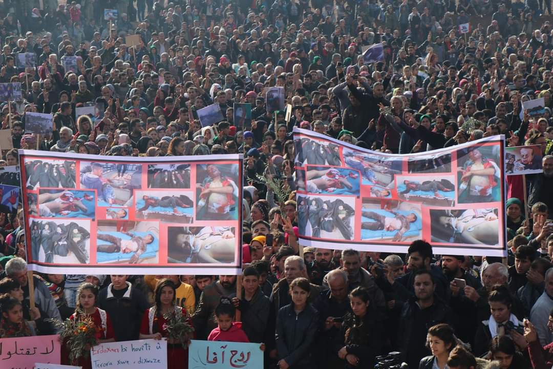 Aynı zamanda zeytin dalları, katliamdaki şehitlerin resimleri taşınarak, “ Çocuk katliamına hayır, Rojava boyun eğmeyecek, Türkiye topraklarımızı işgal ederek çocuklarımızı katlediyor, Rusya sessizliğini koruyor ve Türkiye bizi katlediyor” mesajları verildi.