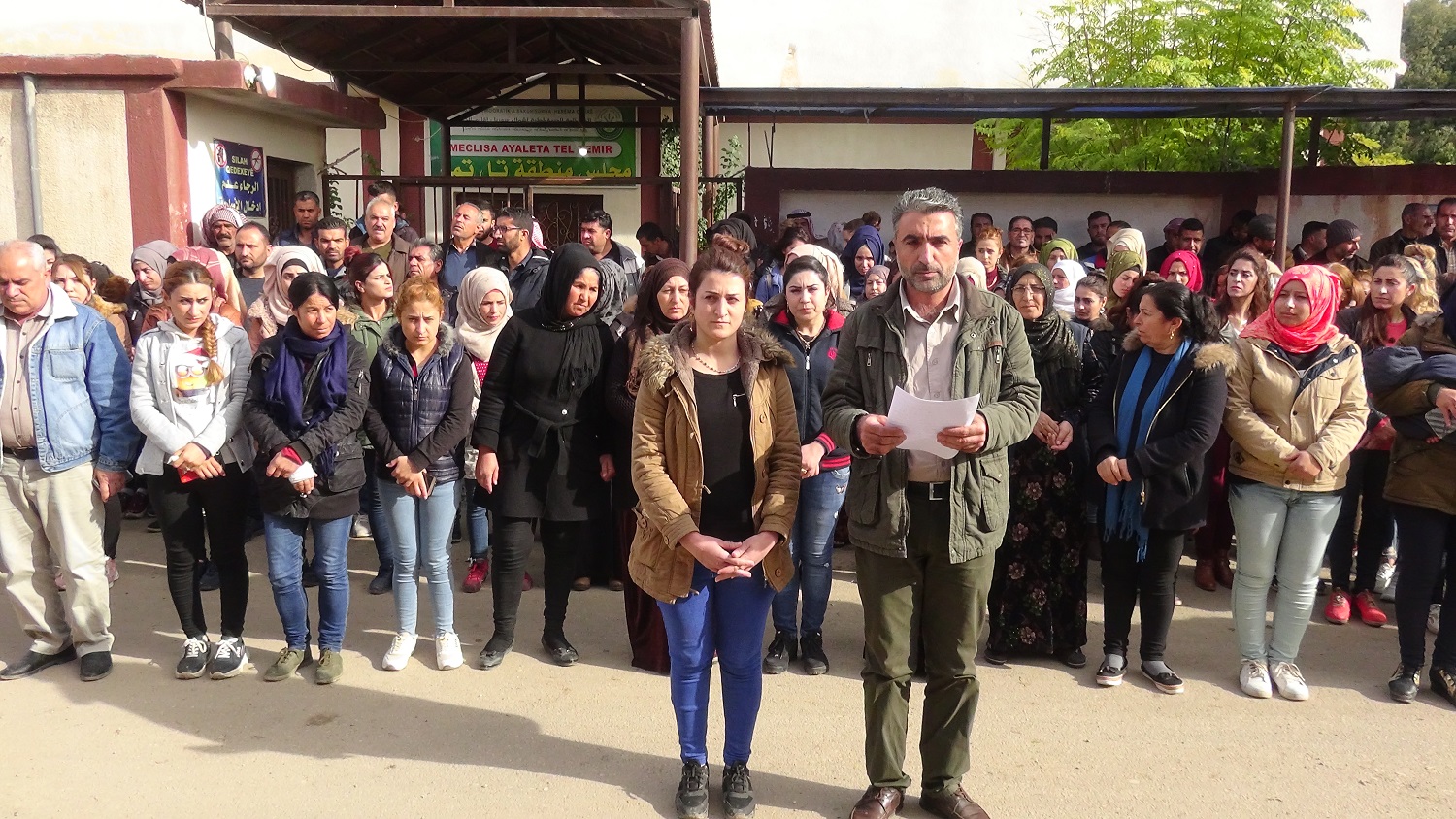 TİL TEMİR – Katliama karşı işgalci Türk devletinin işgal saldırılarının hedefindeki Til Temir’de Halk Meclis önünde basın açıklaması yapıldı. Til Temir halk meclisi önünde yapılan açıklamaya çok sayıda yurttaş katıldı.