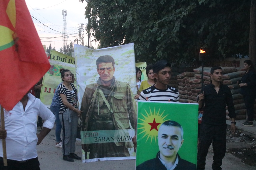 Meşaleli yürüyüşte yüzlerce genç Şehit Helmet ve Şehit Baran Mawa’nın posterlerini taşıyarak yürüdü. Yürüyüş Ciwanên şoreşger merkezinin önünden başlayarak şehitler alanına kadar sürdü. Yürüyüş burada büyük bir mitinge dönüşerek yüzlerce vatandaş katıldı. Burada yapılan konuşmaların ardından “Başkaldır” sloganları eşliğinde sona erdi.