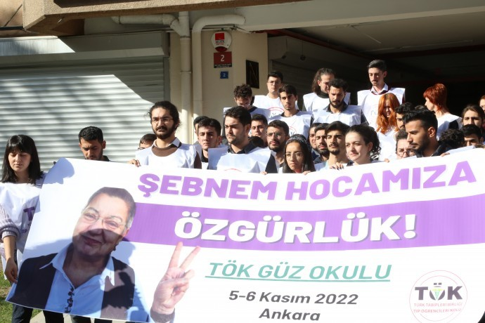ANKARA – Türk Tabipleri Birliği’ne (TTB) bağlı Tıp Öğrencileri Kolu (TÖK), Türkiye’nin kimyasal silah kullanımına dair görüntüleri değerlendirdiği için faşist şef Erdoğan tarafından hedef alınan TTB Merkez Konsey Başkanı Profesör Doktor Şebnem Korur Fincancı’nın tutuklanmasını protesto etti.