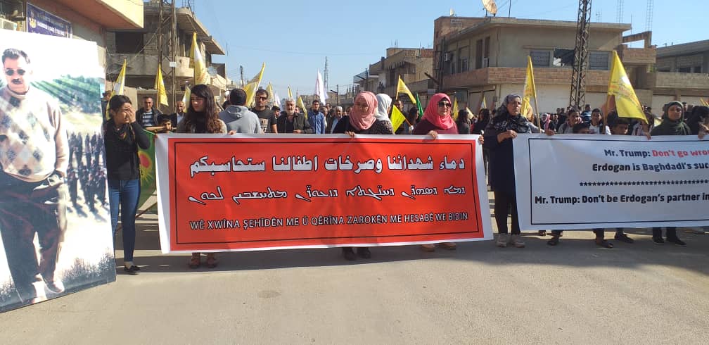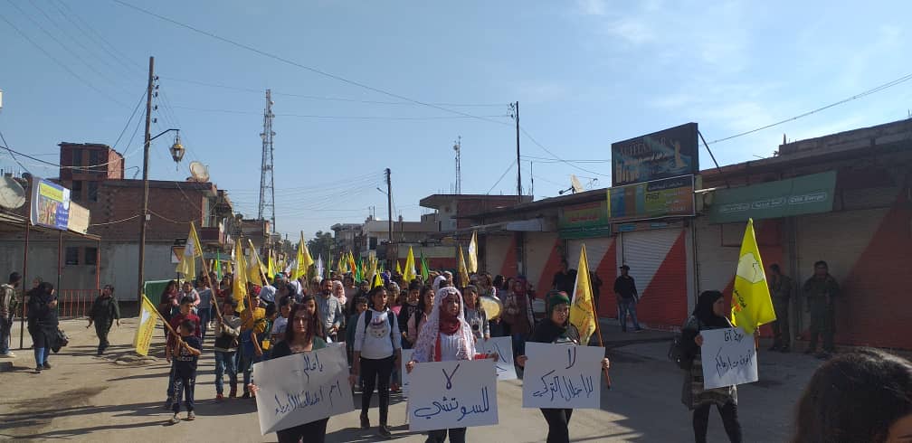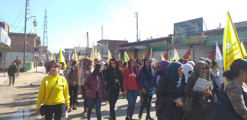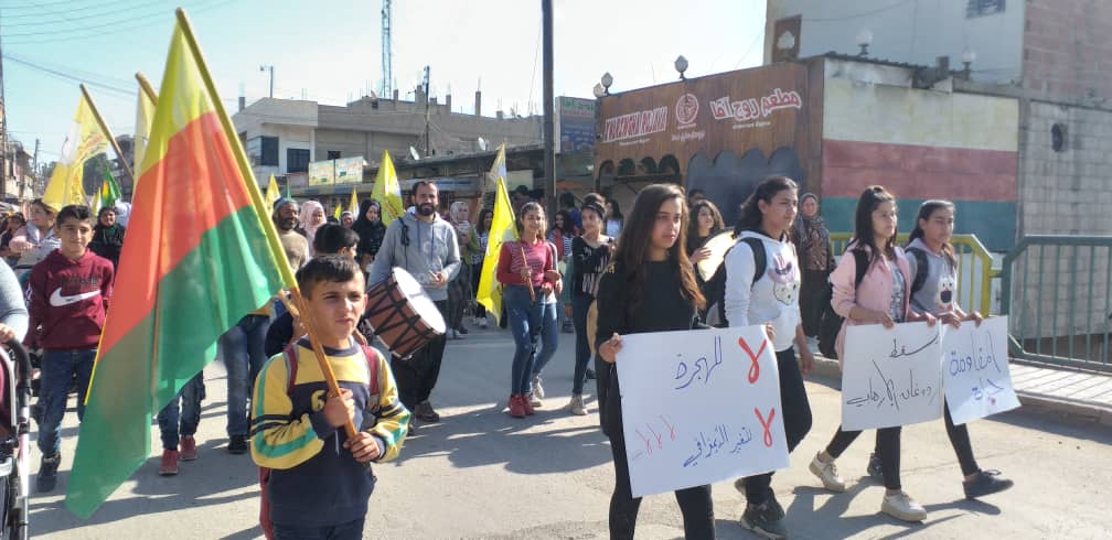 Bu günde Tirbespiyê’de yurttaşlar yürüyüş eylemi ile mevzilerde direnen YPG, YPJ QSD güçlerinin yanında olduklarını gösterdi. Kongra Star merkezi önünde yürüyüşe başlayan binlerce yurttaş “Bijî QSD, YPG, YPJ” ,”Bimre İxanet”sloganları eşliğinde Gençlik Merkezine kadar yürüdü.