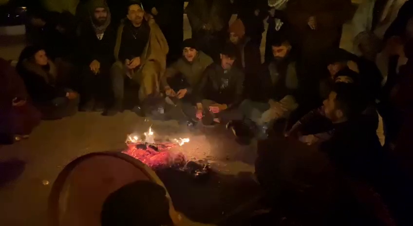 Ateş etrafında toplanan halk, gençler öncülüğünde direniş şarkıları seslendiriyor.