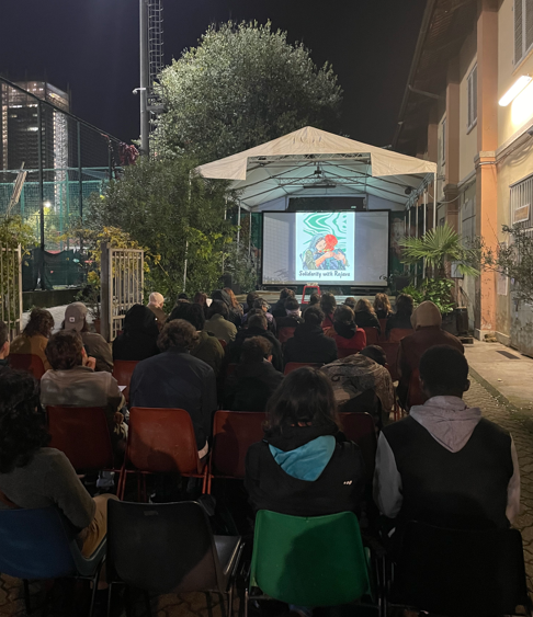 TORİNO – Enternasyonalist gençler İtalya’nın Torino kentinde Kobanê direnişinin 10. Yıl dönümü vesilesiyle kutlama etkinliği düzenlendi. Önder APO’nun kitaplarının da sergilendiği etkinlik basın açıklaması ve kamusal alanda yapılan film gösterimi ile devam etti.