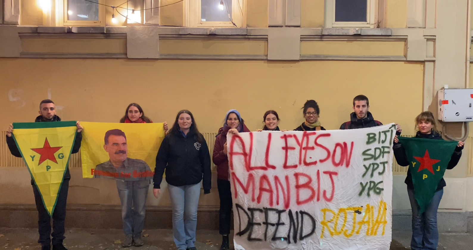 Seminerin ardından “Bütün Gözler Minbic’te, Rojava’yı Savun” yazılı pankart eşliğinde açıklama gerçekleştiren enternasyonalist gençler, açıklamada faşist TC devleti tarafından Rojava’ya yönelik gerçekleştirilen hava saldırılarına dikkat çekti. Barışçıl ve demokratik bir çözüm için çağrı yapan enternasyonalist gençler, kadın özgürlüğü için cesaretle mücadele eden QSD, YPG ve YPJ savaşçılarının yanında olduklarını vurguladı.