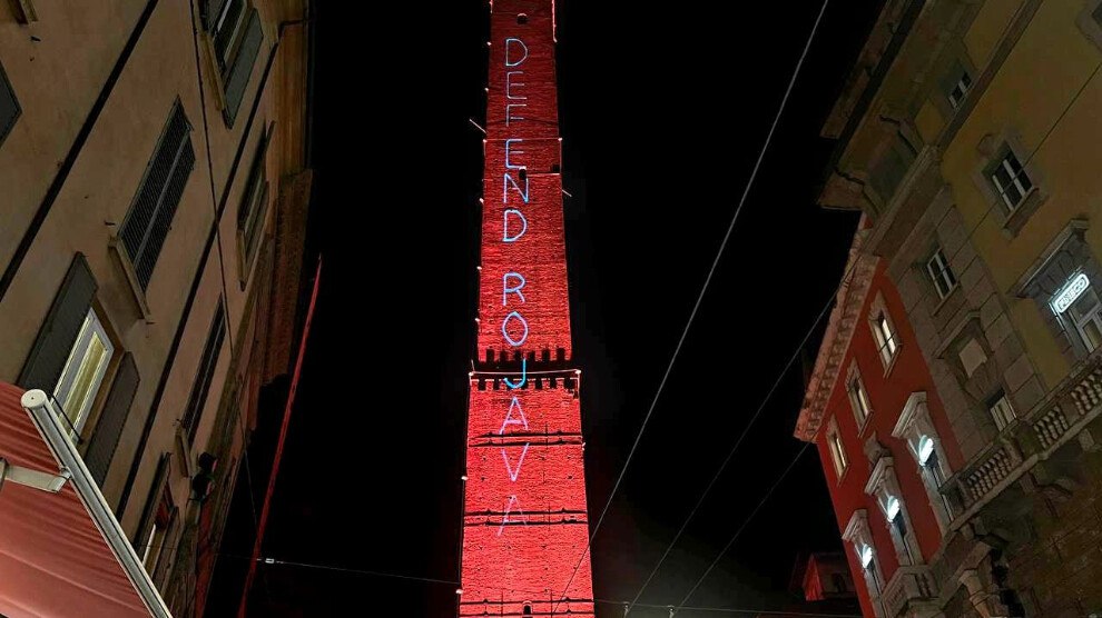Gençler Bologna kentindeki tarihi bir yapıt olan Torre Degli Asinelli’ye Defend Rojava (Rojava’yı Savun) yazısını yansıttı.