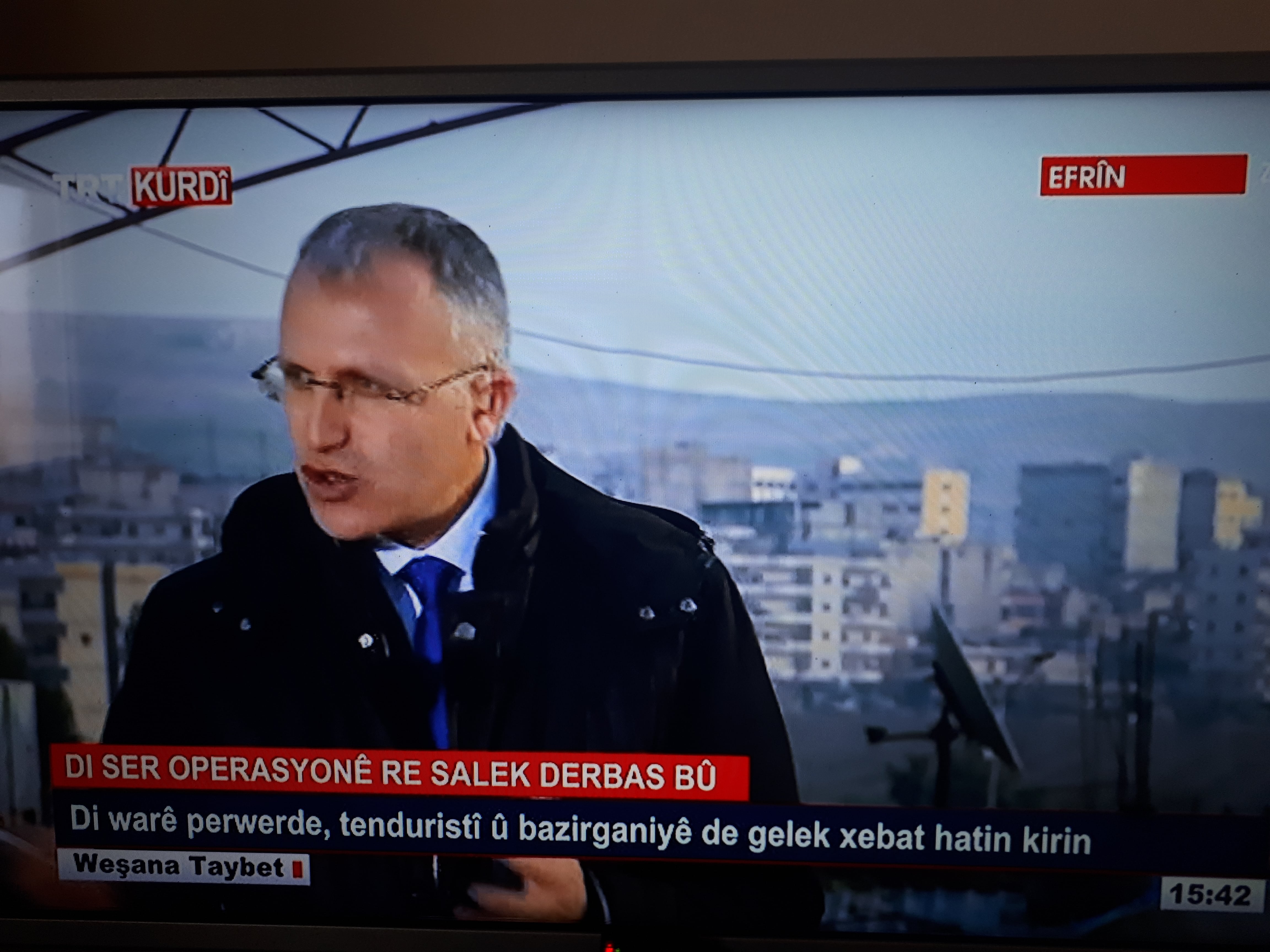 EFRÎN – İşgalci Türk devleti ve ona bağlı çete gruplarının Efrîn’e yönelik işgal saldırıları girişi 1. yılında. TRT Kurdî tarafından Efrîn işgal saldırılarını meşru göstermek için Mehmet Baki’nin sunduğu bir özel yayın ile program yapıldı.