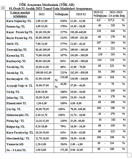 TÖK’ün araştırmasında kullandığı fiyat listesi şöyle: