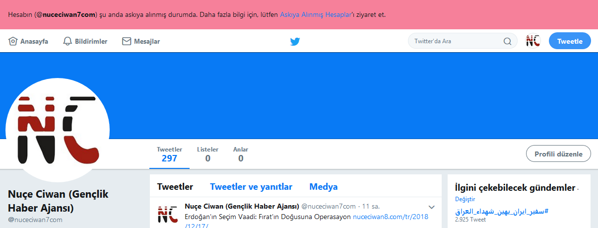 HABER MERKEZİ – Kapatılan hesaplara alternatif olarak açılan “@NuceCiwan7com” twitter hesabı da, işgalci Türk yetkili kurumlarının saldırısına uğrayarak erişime engellendi.