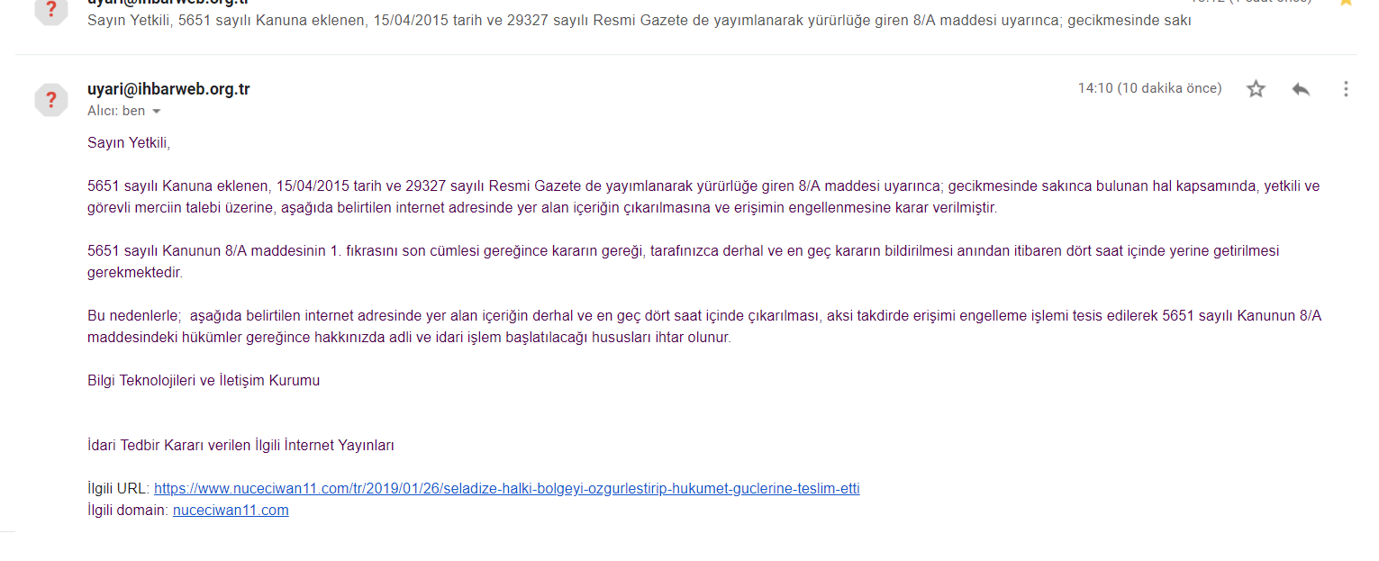 Şeladizê halkının işgalci Türk ordusuna karşı ayaklanmasını an an takip edip okuyucuya ulaştıran Ajansımıza, işgalci Türk devletinden ikinci tehdit maili geldi. Mailde girilen kimi haberlerin kaldırılmasına karar verildiğini belirtip, kaldırılmaması durumda haberin içeriğine Türkiye’de erişimin engelleneceği vurgulandı.
