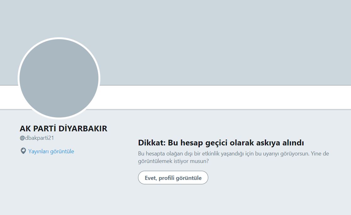 AKP Amed İl Başkanlığı tarafından açılan çok sayıda hesap, İl Başkanlığı’nın @dbakparti21 adlı hesabını takibe yönlendirilince, twitterdan müdahale geldi. Twitter, hesap takibindeki olağandışı artış nedeniyle AKP Amed İl Başkanlığı’nın hesabını geçici süreliğine askıya aldı.