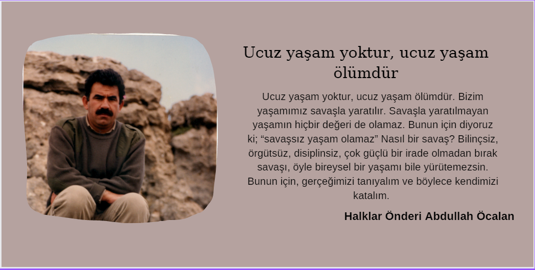 Ucuz yaşam yoktur, ucuz yaşam ölümdür. Bizim yaşamımız savaşla yaratılır. Savaşla yaratılmayan yaşamın hiçbir değeri de olamaz. Bunun için diyoruz ki; “savaşsız yaşam olamaz” Nasıl bir savaş? Bilinçsiz, örgütsüz, disiplinsiz, çok güçlü bir irade olmadan bırak savaşı, öyle bireysel bir yaşamı bile yürütemezsin. Bunun için, gerçeğimizi tanıyalım ve böylece kendimizi katalım. İşte biz bunun için yine 1995 Newroz’una geldik. Bir yandan düşmana bakıyorsun, böyle yüzlerce araçla askerini sınırlara yerleştiriyor, gerillaya doğru geliyor, büyük bir korku içindedir, ama sonuna kadar da kendisini orada tutmak istiyor. “Newroz Kürtlerin dirilişi, benim de ölümümdür” diyor. Bunun için de hesapsızca masraf yapıyor. Düşmanımıza göre kendimizi geliştirelim. Düşman böyle yapıyorsa, biz daha fazlasını yapmalıyız. Sizin için de Newroz büyük bir direnme olsun, 1995’in direnmesi diğerlerinden daha büyük olmalı.