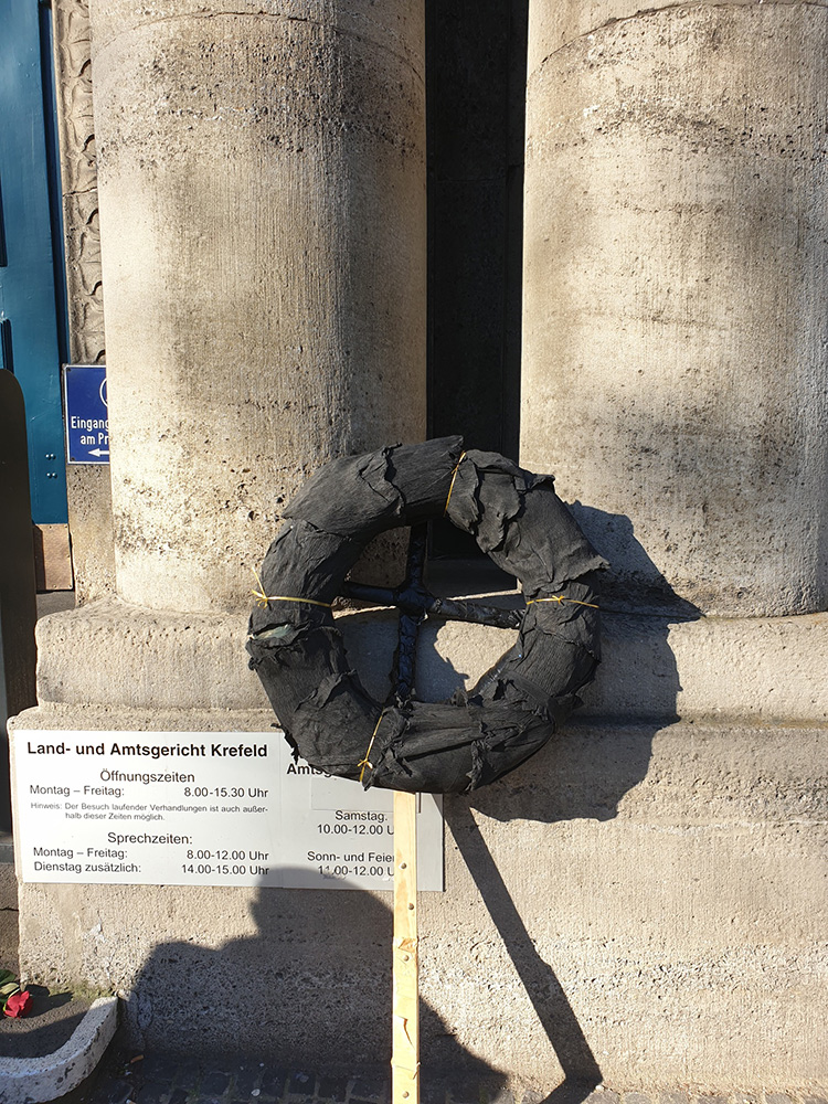 KREFELD – Bugün saat 14:00’da Almanya’nın Krefeld şehrinde Uğur Şakar ivvin bir basın açıklaması düzenlendi. Miting, Uğur Şakar’ın Halklar Önderi Abdullah Öcalan’a uygulanan tecridi protesto etmek için bedenini ateşe verdiği Krefeld Mahkemesi önünde gerçekleşti. Basın açıklamasına katılanlar, Uğur Şakar’ın eylemini gerçekleştirmeden önce yazdığı mektubun Almancası’nın yazıldığı ve fotoğrafının bulunduğu büyük bir pankart taşıdılar. Basın açıklaması sırasında yapılan konuşmalarda Alman polisinin Uğur Şakar’ın eylemine karşı takındığı tavır protesto edildi. Ayrıca, Halklar Önderi Abdullah Öcalan’a uygulanan tecrit işkencesinde Alman devletinin oynadığı rolü protesto etmek için mahkemenin önüne siyah bir çelenk konuldu.
