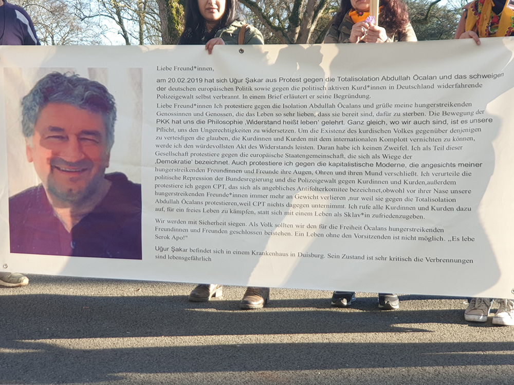 Uğur Şakar, 20 Şubat Çarşamba günü sabah saatlerinde Halklar Önderi Abdullah Öcalan’a uygulanan tecridi protesto etmek için Krefeld Mahkemesi önünde bedenini ateşe vermişti. Vücudunda %67 oranında yanık oluşan Uğur Şakar hala Unfallklinik Duisburg hastanesinde tedavi altında ve sağlık durumu ciddiyetini koruyor. Uğur Şakar, eylemini gerçekleştirmeden önce yazdığı mektubunda Halklar Önderi Abdullah Öcalan’a uygulanan tecridi artık daha fazla kabul edemeyeceğini ve süresiz dönüşümsüz açlık grevlerine duyarsızlığı kırmak istediğini belirtmişti.