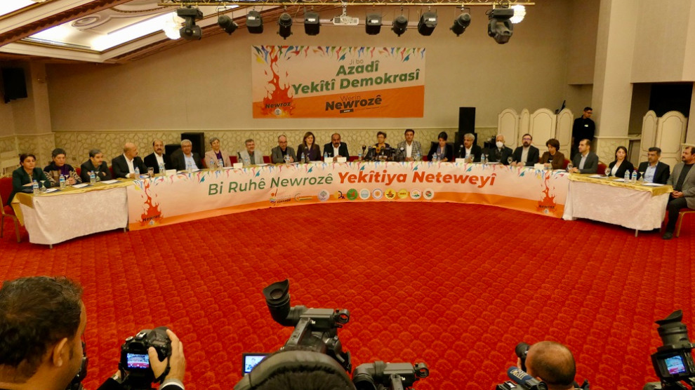 AMED – Bu yıl Kürtçe “Ji bo azadî, yekîtî, demokrasî, Türkçe ise “Demokrasi, adalet, özgürlük için” şiarıyla kutlanacak Newroz Bayramı’nın startı, Amed’de verildi. Demokratik Toplum Kongresi (DTK), Halkların Demokratik Kongresi (HDK), Özgür Kadın Hareketi (TJA), Demokratik Bölgeler Partisi (DBP), Halkların Demokratik Partisi (HDP), Azadî Partisi, Devrimci Demokratik Kürt Derneği (DDKD), İnsan ve Özgürlük Partisi (PİA), Kürdistan Komünist Partisi (KKP) ve Kürdistan Demokrat Partisi’nin (KDP-Bakur) eş genel başkanları, eş sözcüleri ve genel başkanları ile HDP milletvekillerinin katılımıyla Sur’daki bir otelde basın toplantısı düzenlendi. Toplantının yapıldığı salona, “Ruhê Newrozê yekîtiya neteweyî” ve “Ji bo azadî, yekîtî, demokrasî werin Newrozê” yazılı pankart asıldı.