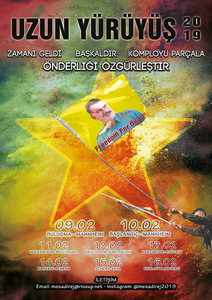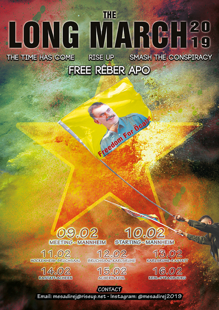 Almanya’nın Mannheim şehrinde 10 Şubat’ta başlayacak olan Uzun Yürüyüş (Meşa Dirêj) için hazırlık çalışmaları yoğun bir şekilde devam ediyor. Hazırlık Komitesi bugün Uzun Yürüyüş’ün tanıtım afişlerini paylaştı. Uzun Yürüyüş “Zamanı geldi, Başkaldır, Komployu Parçala, Önderliği Özgürleştir” şiarıyla gerçekleştirilecek.