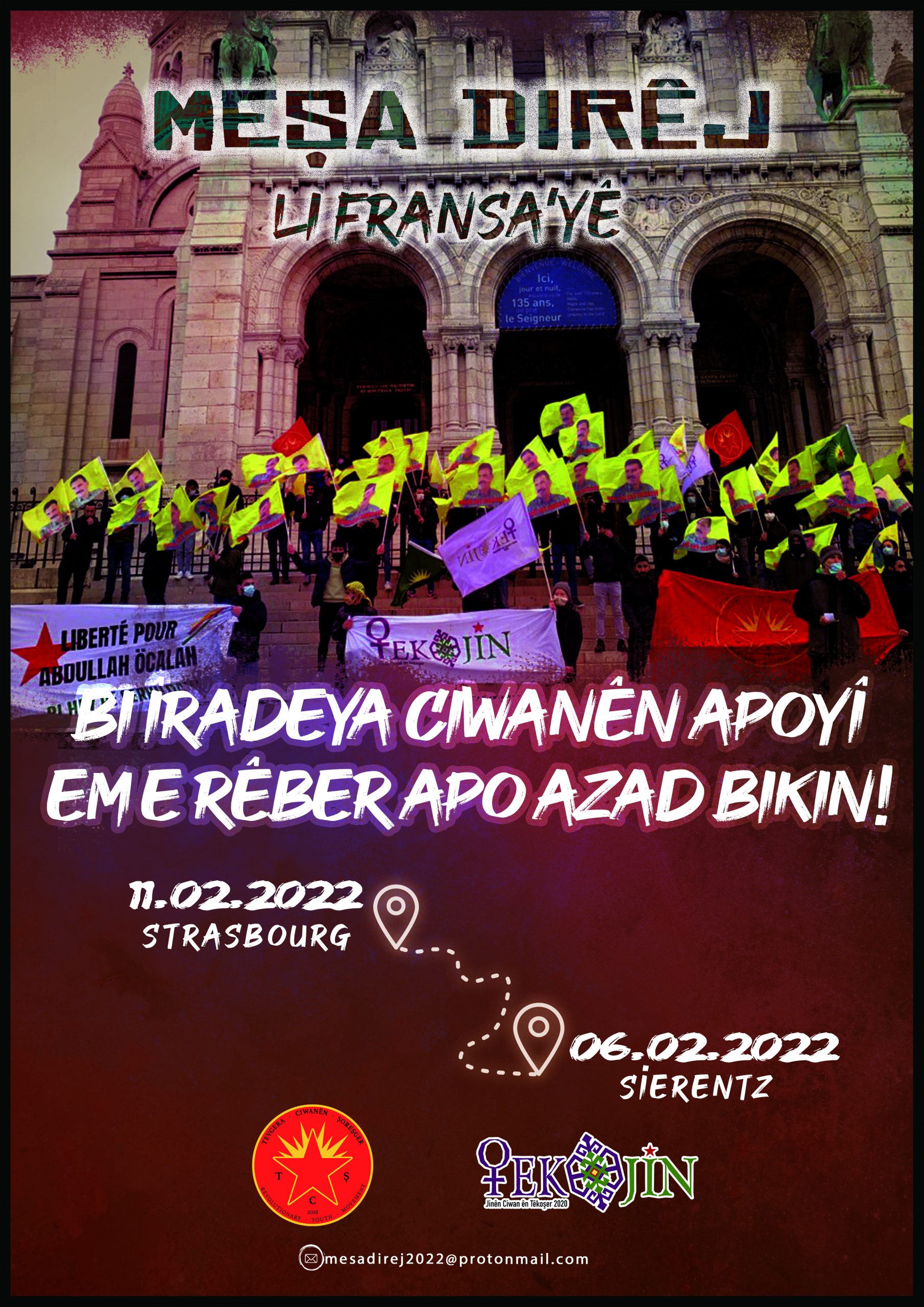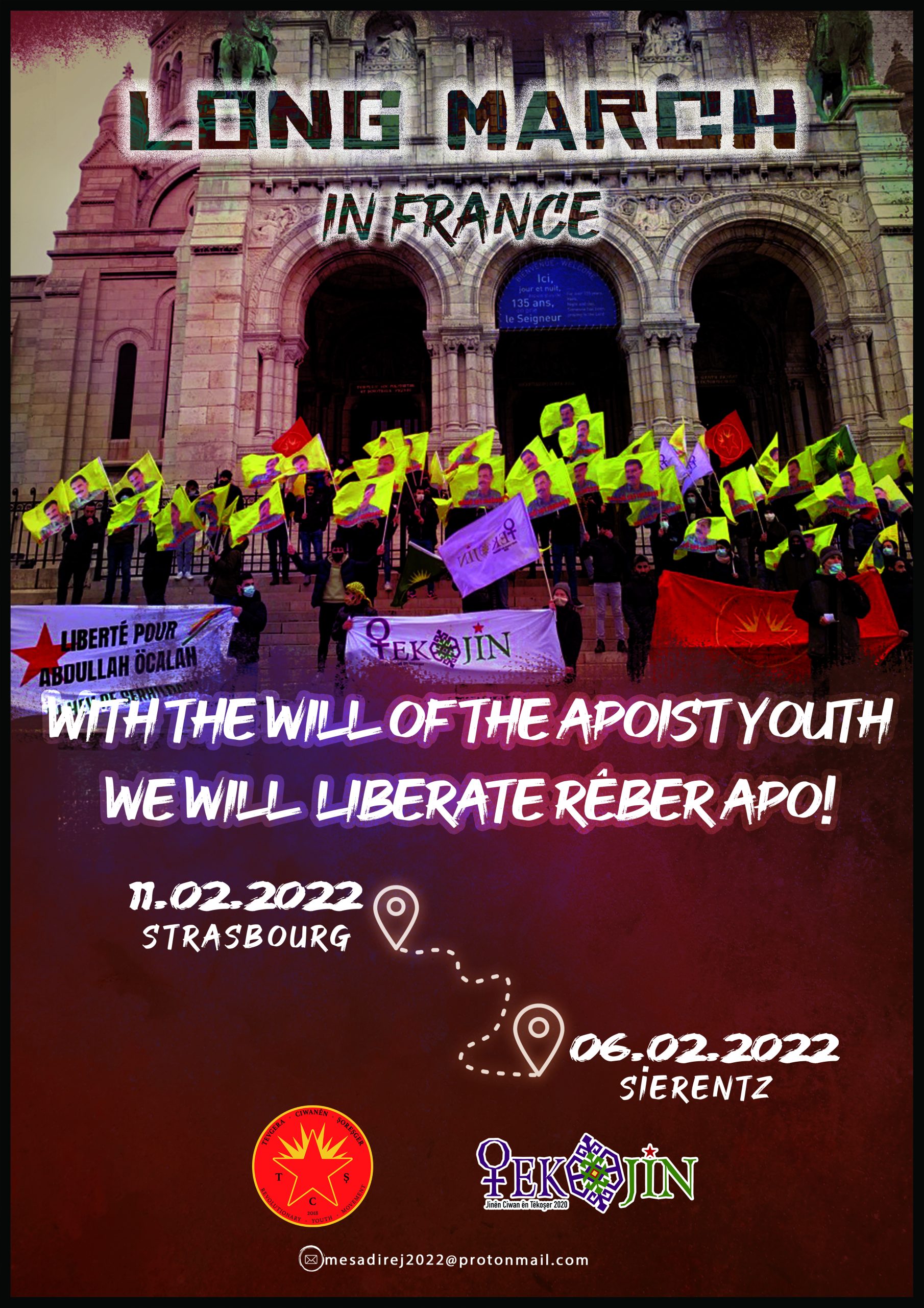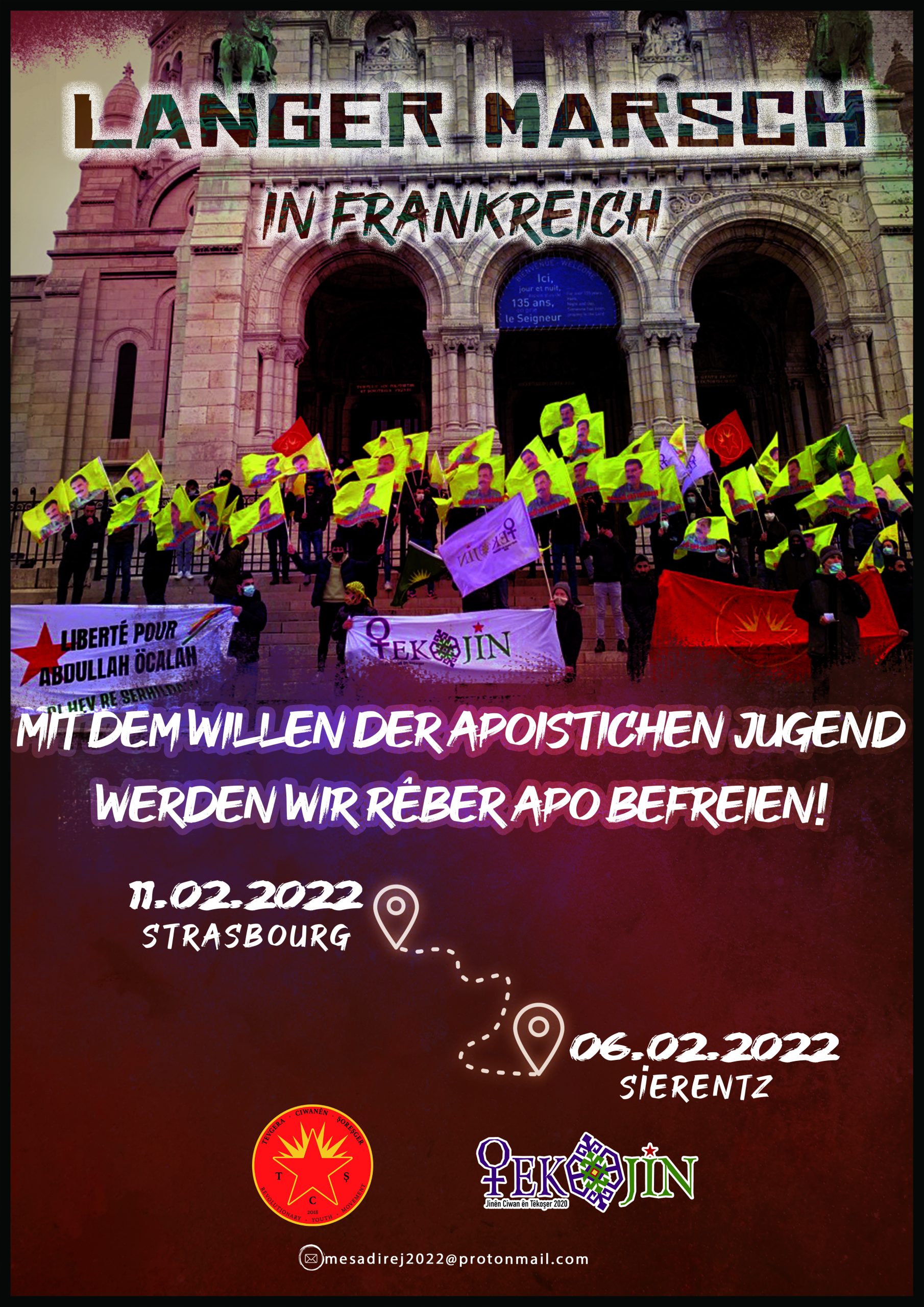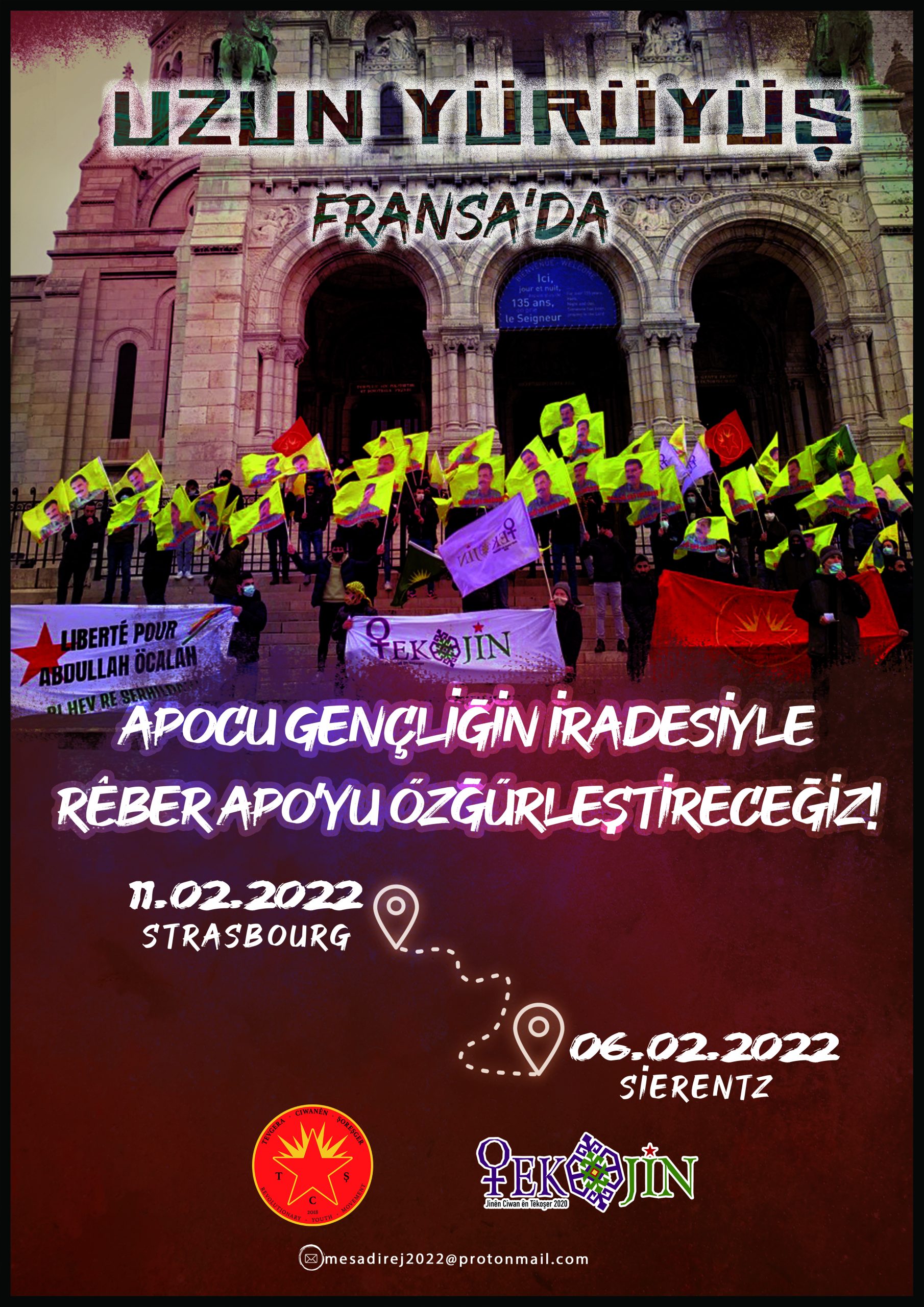 HABER MERKEZİ – Avrupa Devrimci Gençlik Hareketleri TCŞ (Tevgera Ciwanên Şoreşger) ve TekoJIN (Jinên Ciwan ên Tekoşer) öncülüğünde her yıl geleneksel olarak Halklar Önderi Abdullah Öcalan’ın özgürlüğü talebiyle düzenlenen Uzun Yürüyüş eylemi, bu sene 06-11 Şubat tarihleri arasında Fransa’nın Sierentz şehrinden Strasbourg şehrine kadar, “BI ÎRADEYA CIWANÊN APOYÎ EM E RÊBER APO AZAD BIKIN” şiarıyla düzenlenecek.